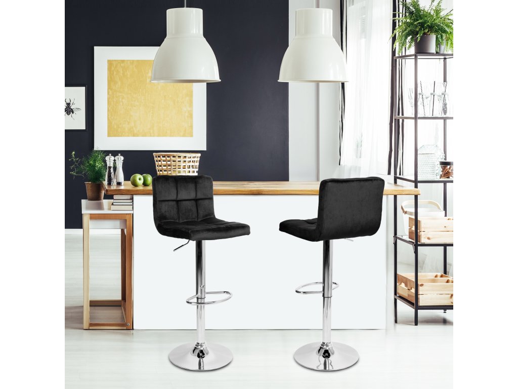 Vrtljivi barski stol, kromirana konstrukcija, črna barva, material velur, kovina, podnožje, nosilnost 110 kg