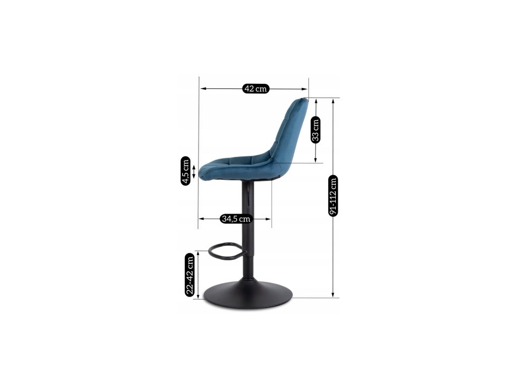 Barski stol Arcos2, jeklo, velur, skupna višina 112 cm, nastavljiva po višini, širina sedeža 45 cm, največja obremenitev 100 kg, modra.