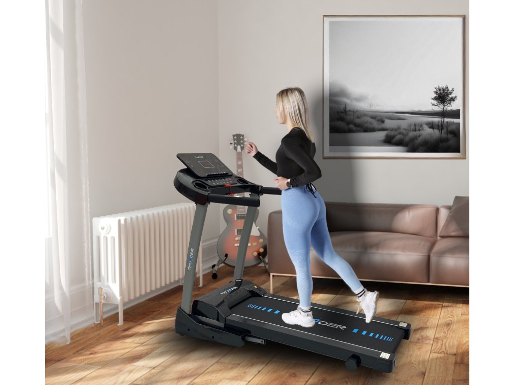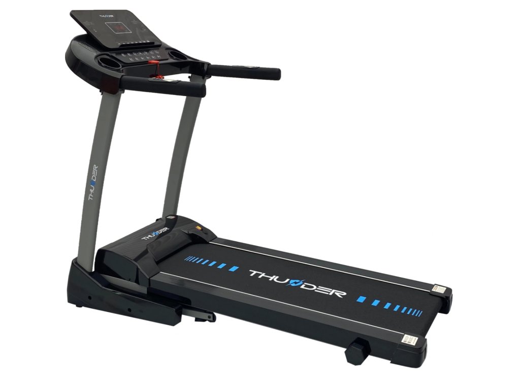 Tekalna steza Thunder Neto, barva: črna, siva, teža: 54 kg, največja nosilnost: 120 kg, hitrost: 0,8 km/h do 18 km/h, mere: širina: 72 cm, višina: 136 cm, dolžina: 171 cm