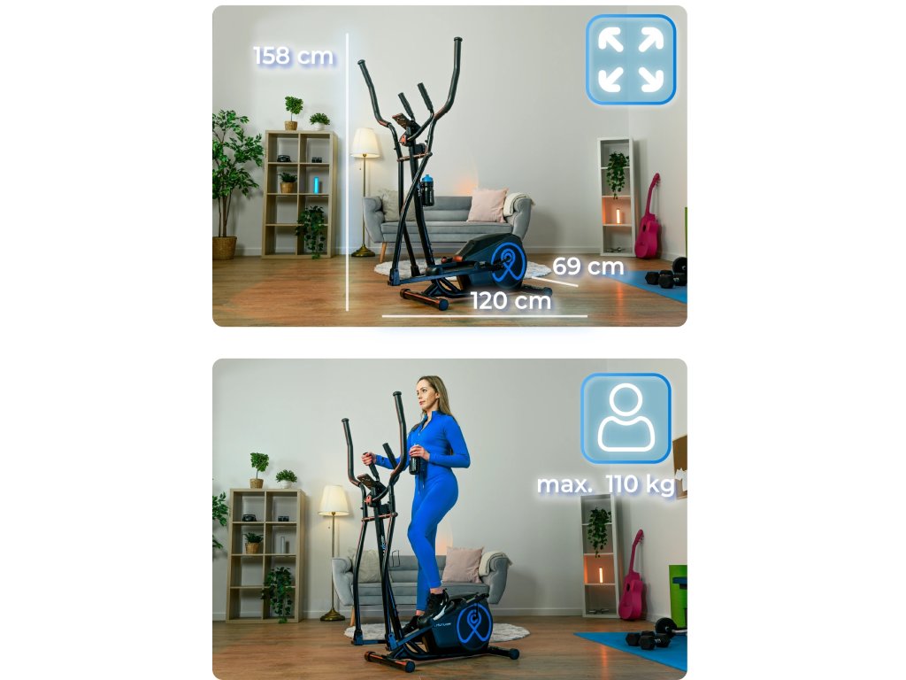 Eliptični trenažer Sparky, sistem magnetnega upora: 16 nivojev, dolžina: 120 cm, širina: 69 cm, višina: 158 cm, teža izdelka: 36 kg, največja nosilnost: 110 kg