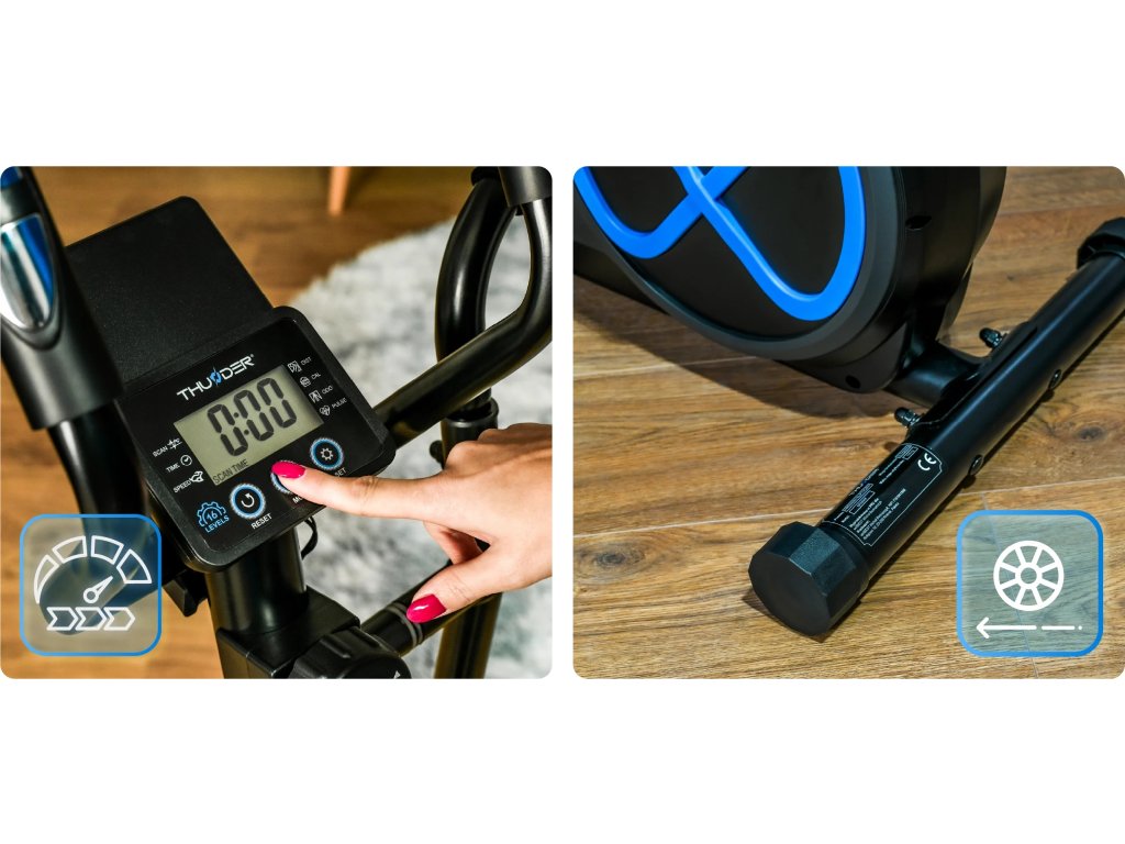 Trenažer je opremljen z digitalnim zaslonom, ki prikazuje čas vadbe, prevoženo razdaljo, hitrost, število porabljenih kalorij in srčni utrip. Zahvaljujoč podatkom lahko enostavno spremljate svoj napredek in prilagodite trening glede na svoje cilje