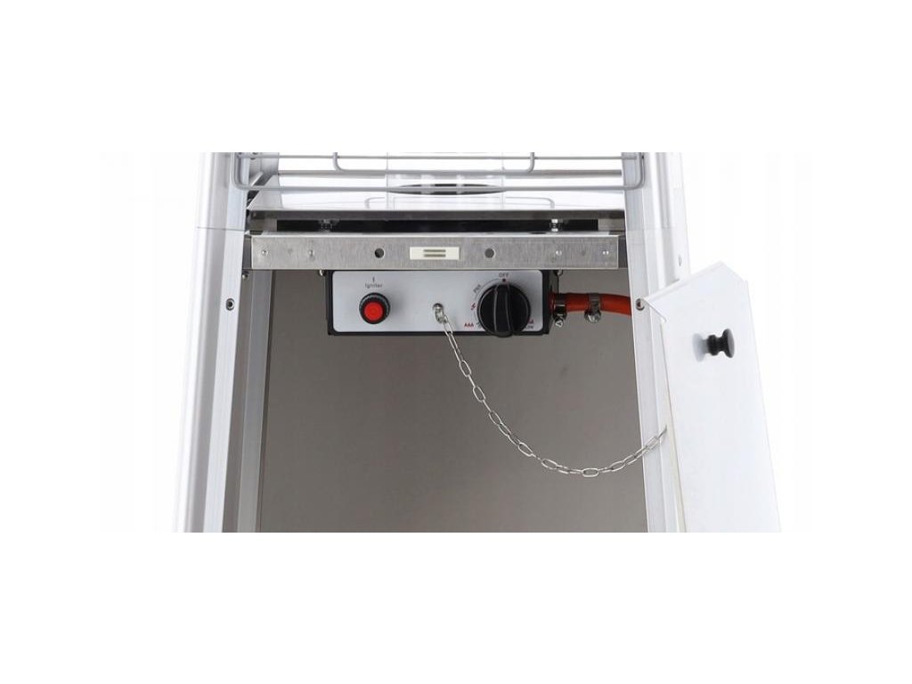 Za večjo varnost je naprava opremljena z zaščito proti prevrnitvi, ki samodejno izklopi grelec v primeru prevrnitve. Elektronsko vžiganje omogoča enostaven in varen zagon. Grelec ima udoben temperaturni regulator, s katerim lahko prilagodite intenzivnost ogrevanja glede na vaše potrebe.