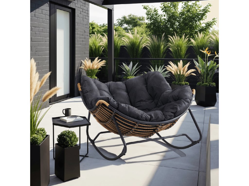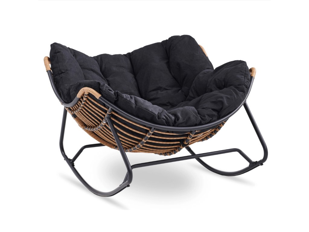 Osnova je trdna kovinska konstrukcija, ki zagotavlja stabilnost tudi pri dolgotrajni uporabi. Gugalne sani omogočajo tekoče gibanje brez škripanja, črni okvir s prašnim premazom pa stol naredi primeren tudi za zunanje pogoje.