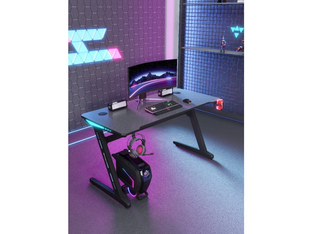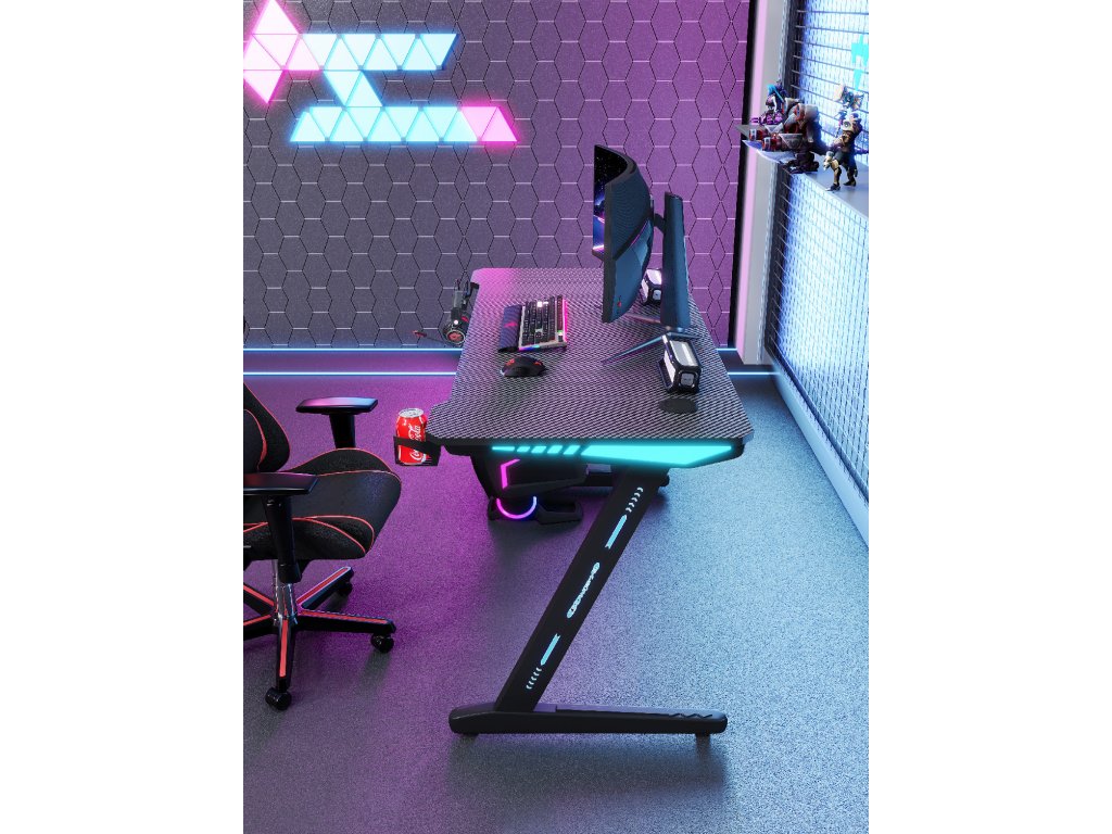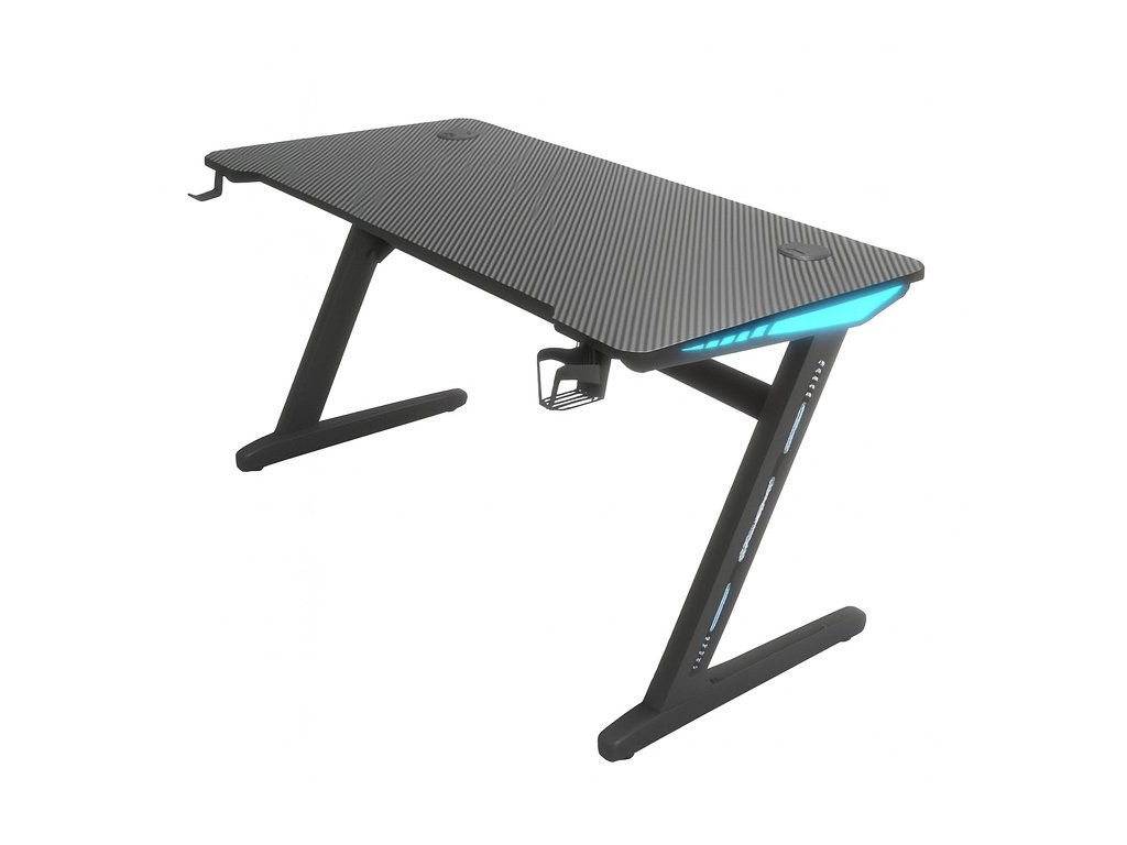 RGB LED trakovi ob straneh plošče ustvarijo edinstveno vzdušje med igranjem in delom. Osvetlitev lahko priključite preko USB in prilagodite barvo ali učinek glede na vaše razpoloženje. Praktične odprtine za kable ohranjajo vaš prostor urejen, držalo za pijačo in kljukica za slušalke pa poskrbita za maksimalno udobje.