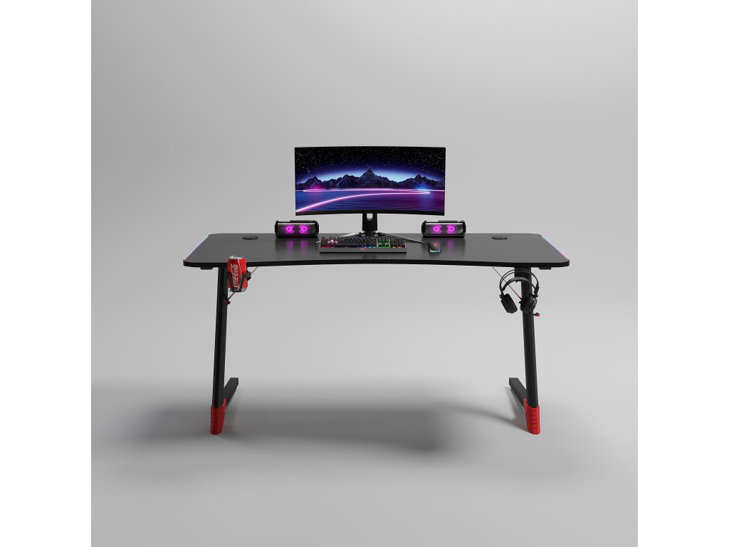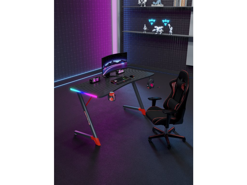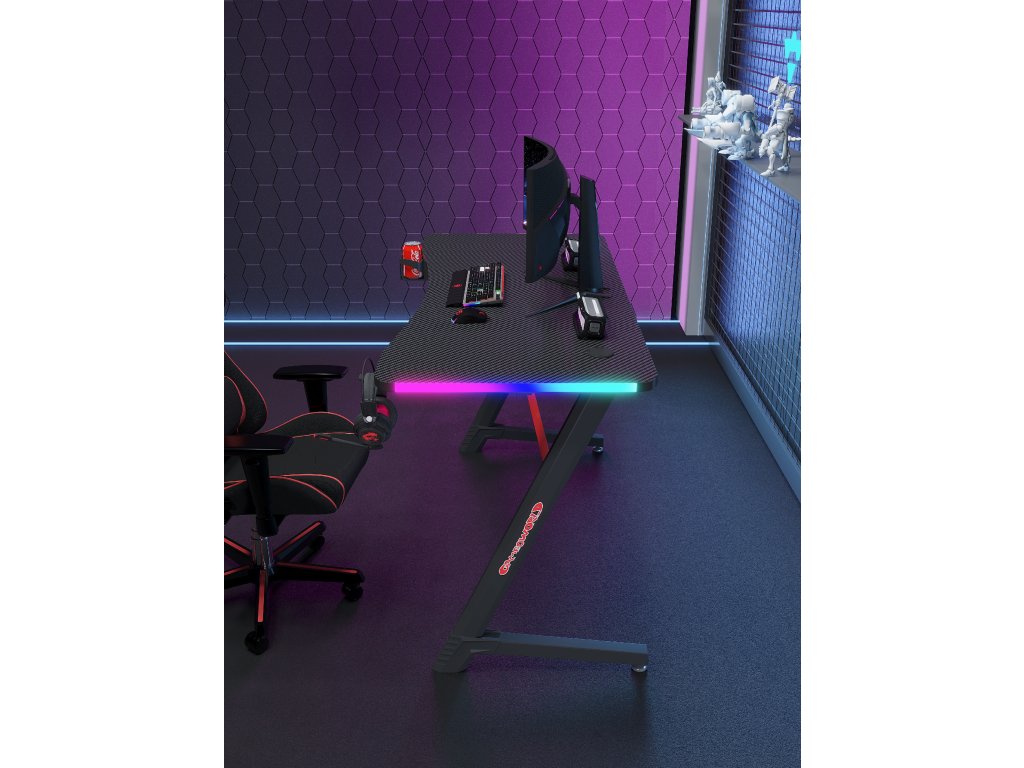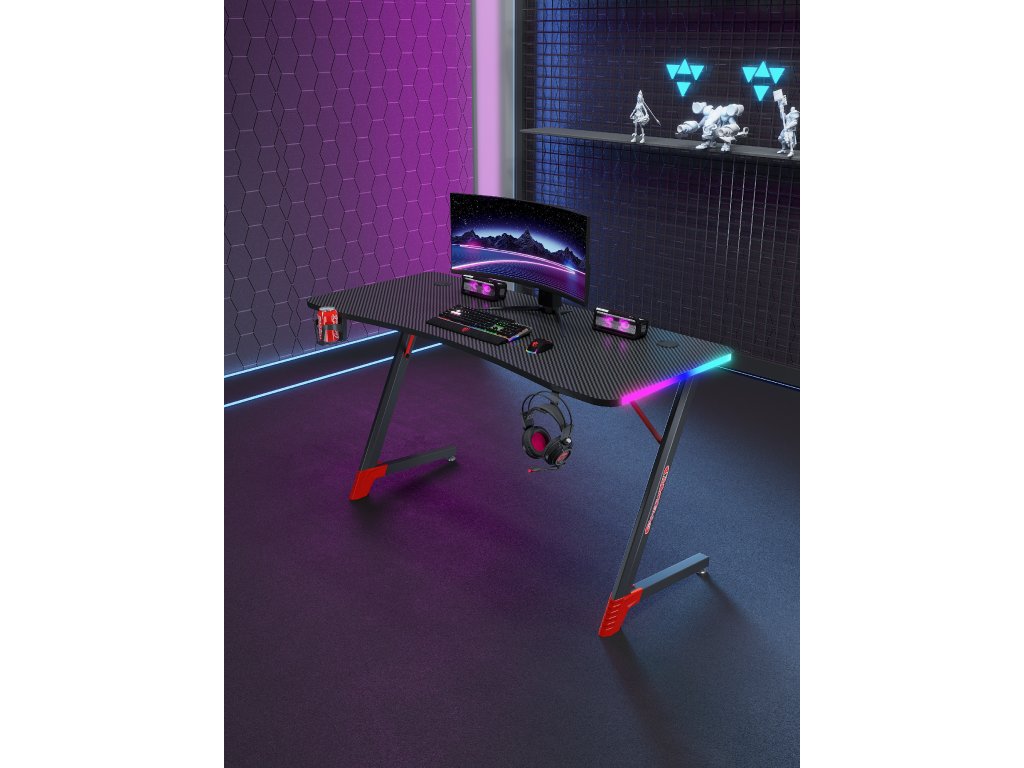 RGB LED trakovi ob straneh plošče ustvarijo edinstveno vzdušje pri igranju ali delu. Osvetlitev lahko priključite prek USB in prilagodite barvo ali učinek svojemu razpoloženju. Praktični prehodi za kable poskrbijo, da bo vaš prostor vedno urejen, medtem ko nosilec za pijačo in kavelj za slušalke zagotavljata maksimalno udobje.
