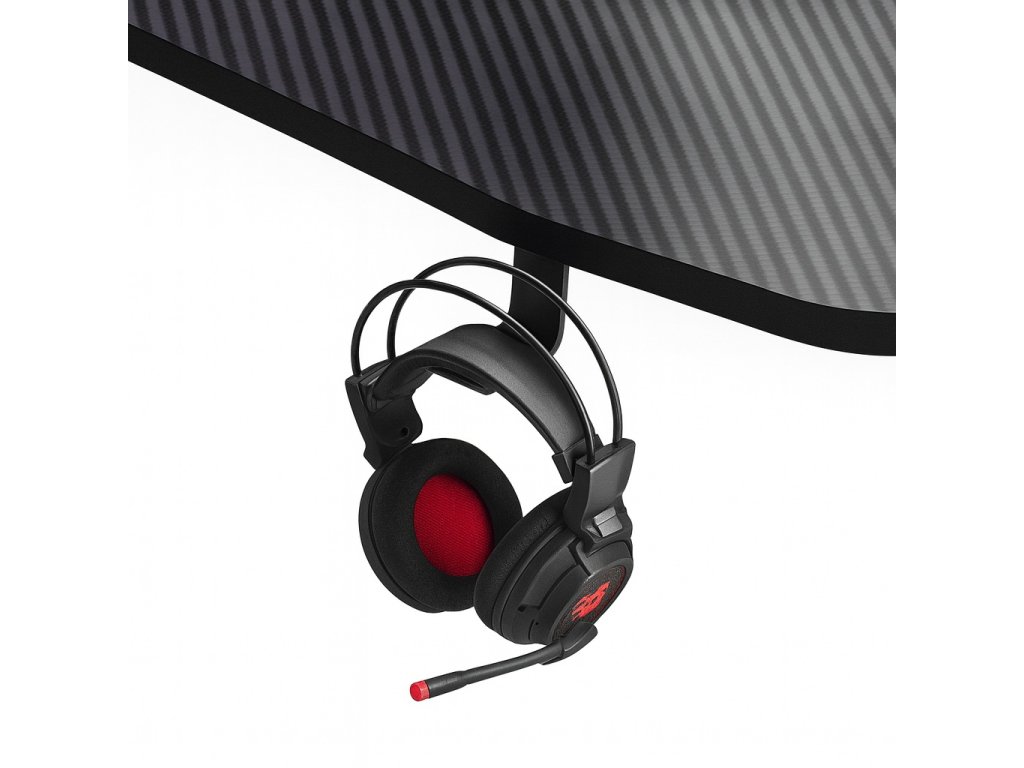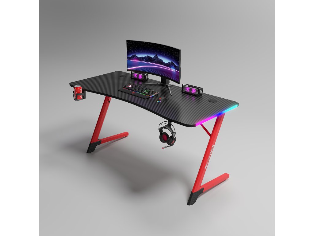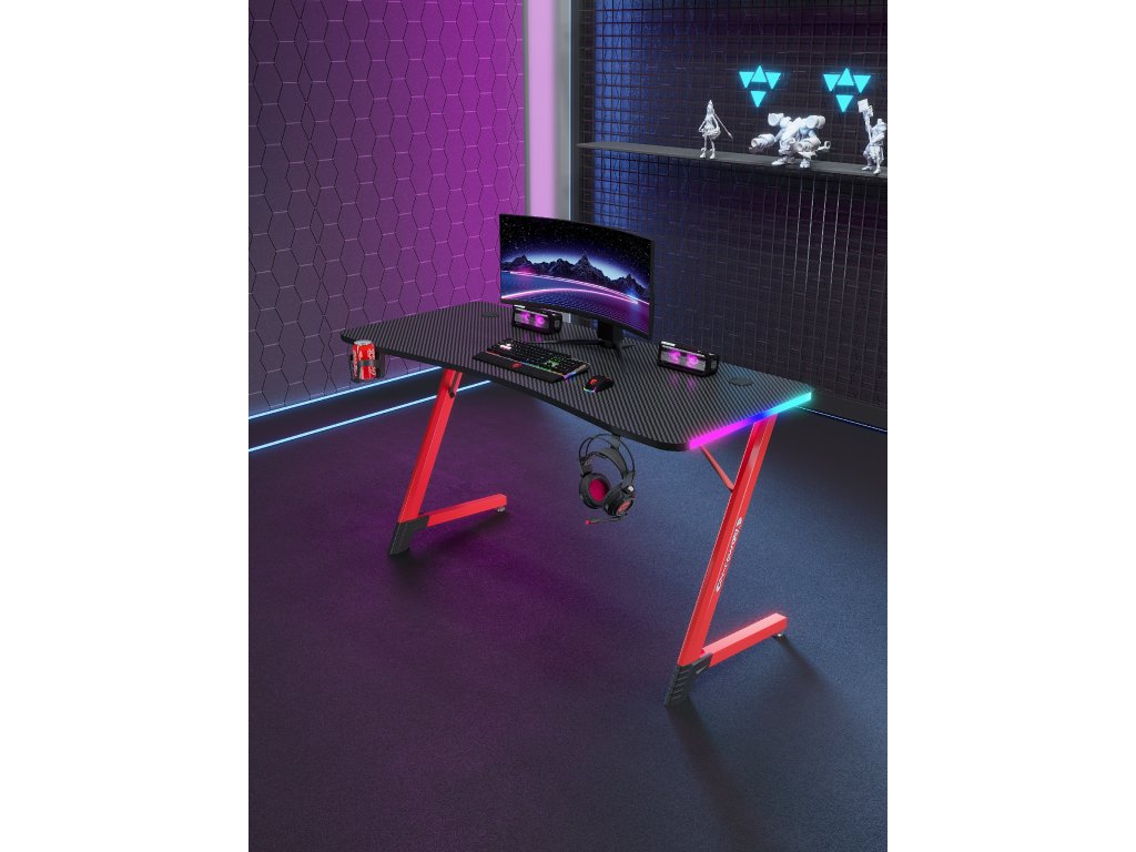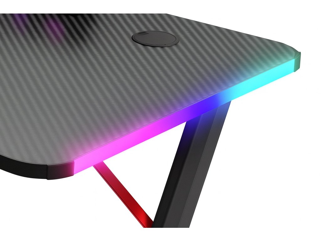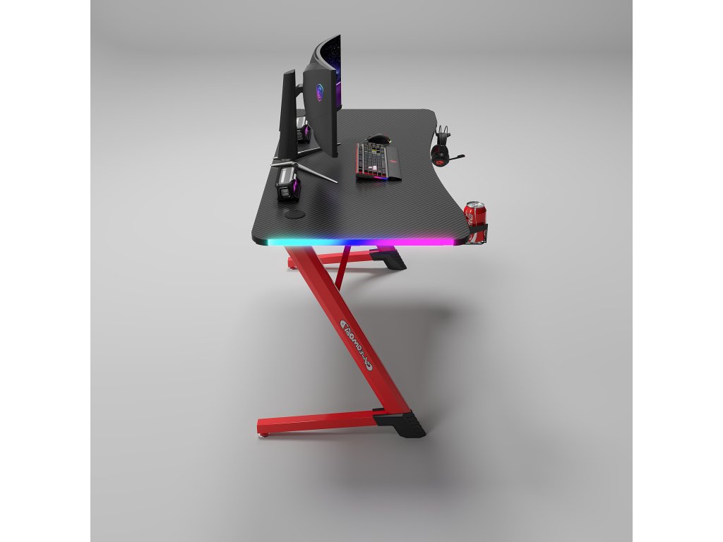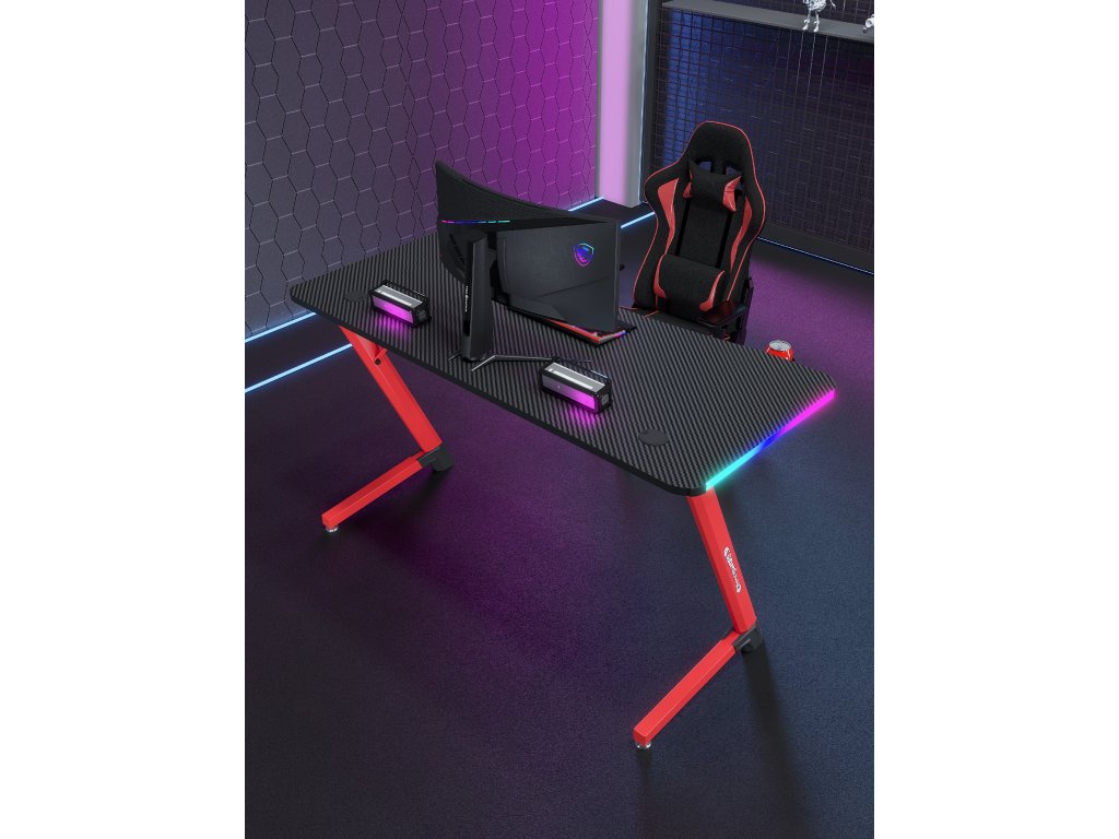 RGB LED trakovi ob straneh plošče ustvarijo edinstveno vzdušje pri igranju ali delu. Osvetlitev lahko priključite prek USB in prilagodite barvo ali učinek svojemu razpoloženju. Praktični prehodi za kable poskrbijo, da bo vaš prostor vedno urejen, medtem ko nosilec za pijačo in kavelj za slušalke zagotavljata maksimalno udobje.