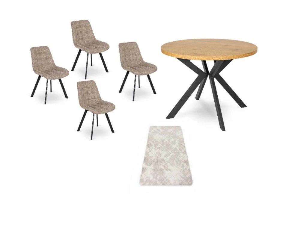 Okrogla miza s trdnim kovinskim podstavkom postane središče pozornosti, kraj, kjer postrežemo nedeljsko jutro s kavo ali večerni pogovor ob zatemljeni svetlobi. Nežno oblazinjeni stoli v zemeljskih tonih dopolnjujejo celoto in prinašajo mehkobo, ki si jo telo zapomni.