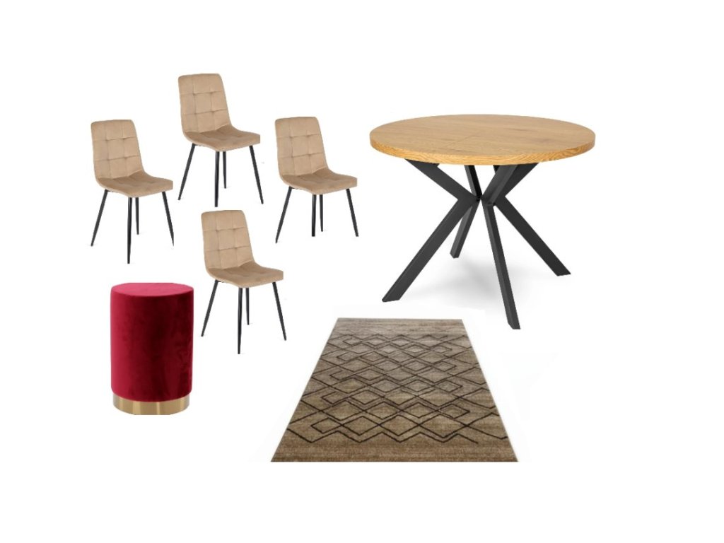 Predstavljajte si prostor, ki vas pozdravi z eleganco in toplino hkrati. Okrogla jedilna miza s trdno kovinsko konstrukcijo postane srce celotne sobe, kraj, kjer se rojevajo pogovori, smeh in mirna jutra. Bež oblazinjeni stoli z nežnim šivanjem dodajo interierju prefinjenost, hkrati pa nudijo udobje, ki ga boste cenili ob vsakem sedenju.