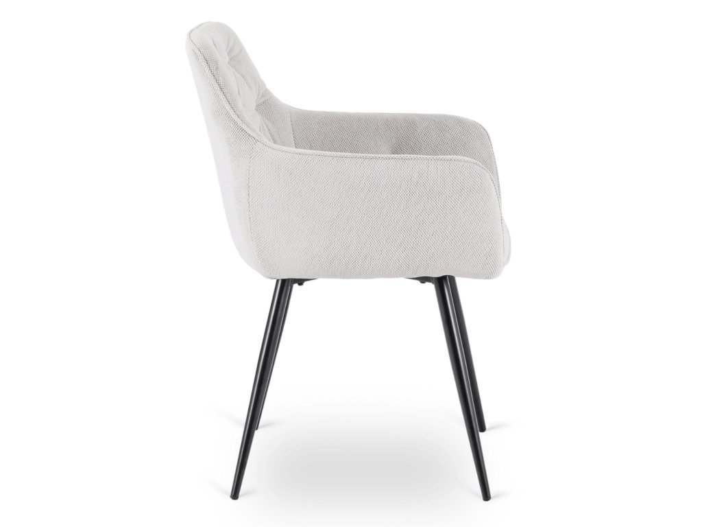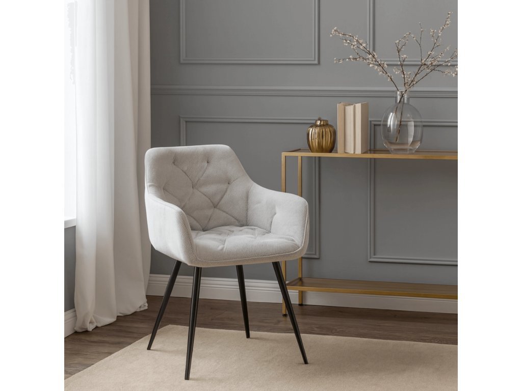 Stol je oblazinjen z nežno krem tkanino, ki deluje elegantno in prijetno. Notranja polnila sestavlja 6 cm mehke pene za udobno sedenje, konstrukcija pa je iz trdne kovine s prašno lakirano površino za maksimalno stabilnost.