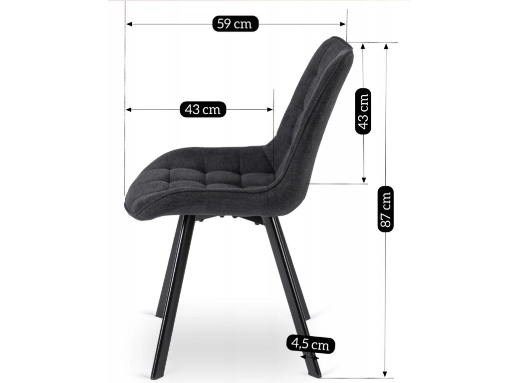 Širina je 53 cm, globina 59 cm in višina 87 cm. Sedež ima globino 43 cm in višino 49 cm.