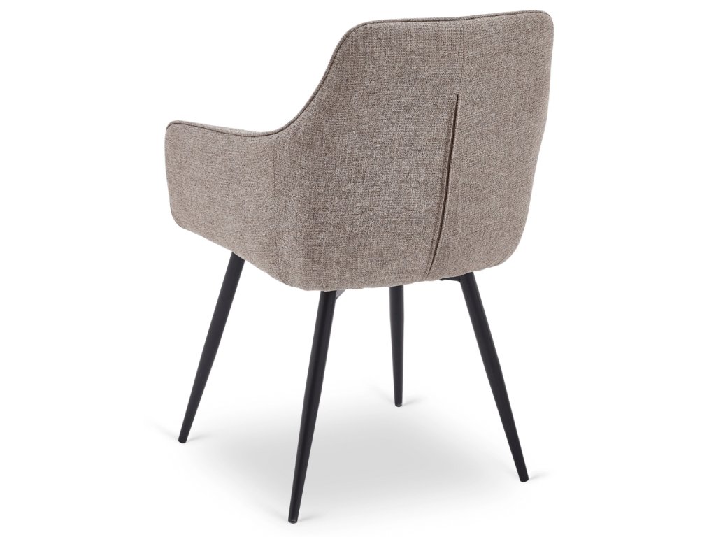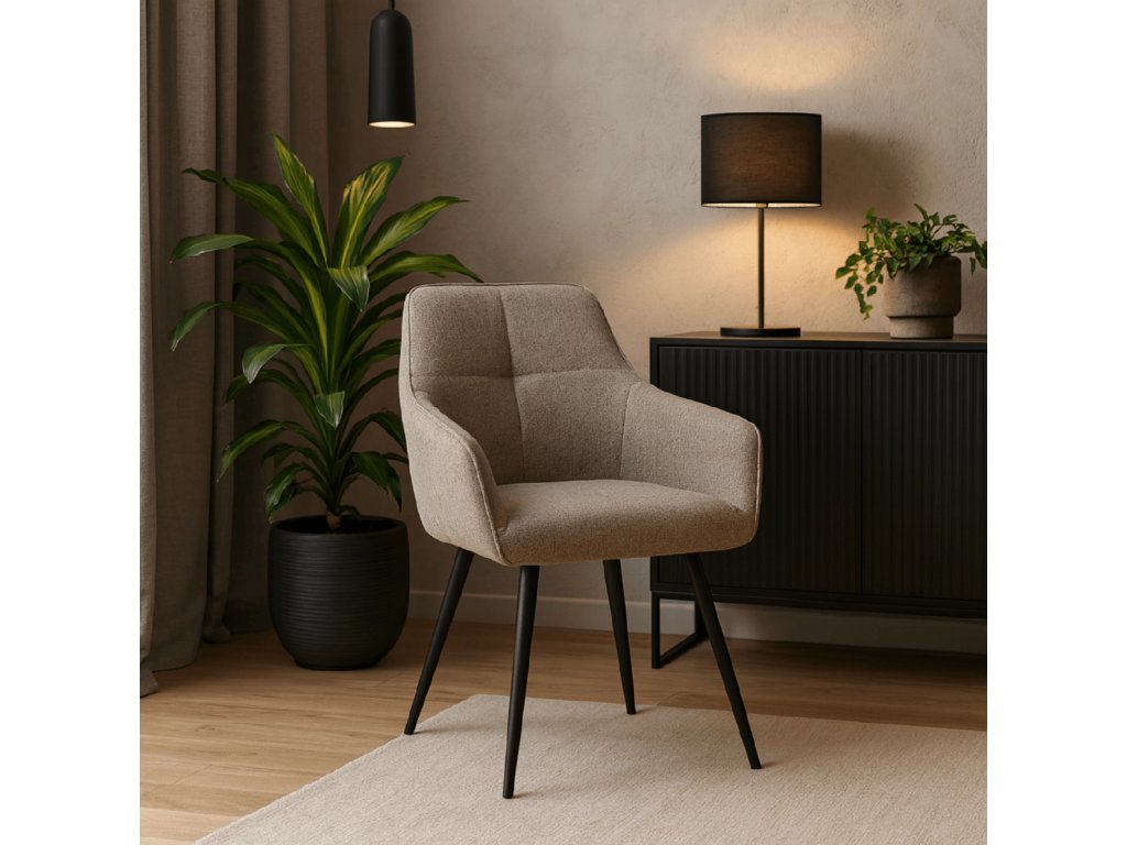 Stol je oblazinjen s kakovostno tkanino, prijetno na dotik in odporno na vsakodnevno uporabo. Svetlo rjava barva vnese v prostor toplino in harmonijo, medtem ko trdna kovinska konstrukcija v črni barvi zagotavlja stabilnost in varnost. Mehko 10 cm debelo sedišče z vgrajenimi vzmetmi nudi udobje tudi pri daljšem sedenju.