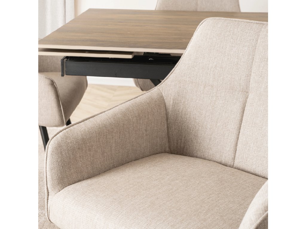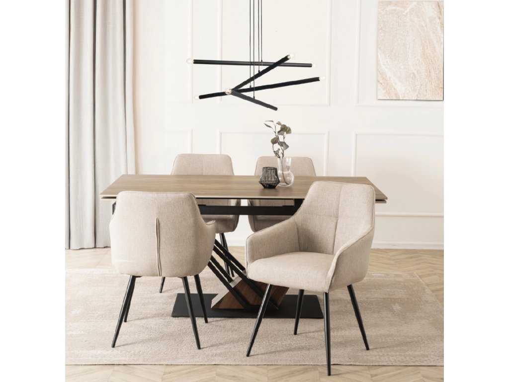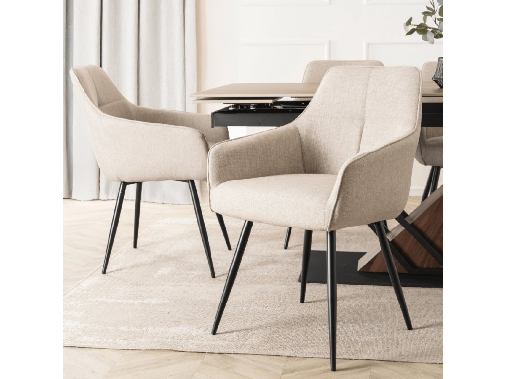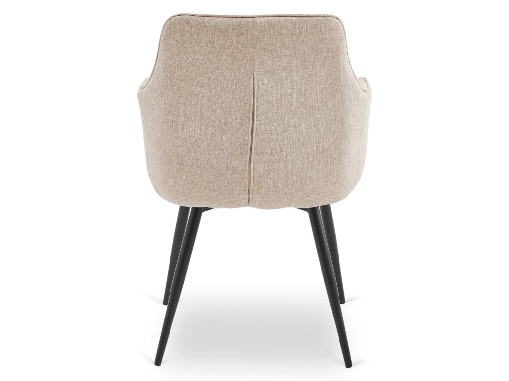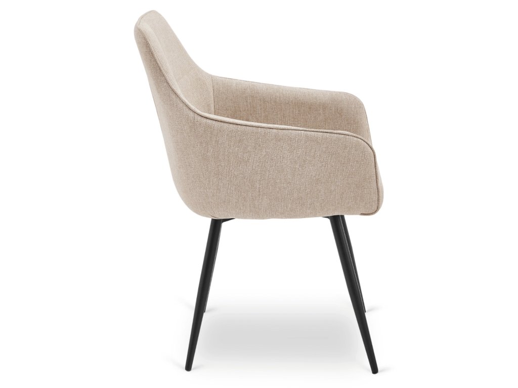 Stolica je oblazinjena s kakovostno tkanino, prijetno na dotik, ki je odporna na vsakodnevno uporabo. Bež odtenek prinaša v prostor toplino in harmonijo, medtem ko trdna kovinska konstrukcija v črni barvi zagotavlja stabilnost in varnost. Mehko 10 cm debelo sedišče z vgrajenimi vzmetmi nudi udobje tudi pri daljšem sedenju.