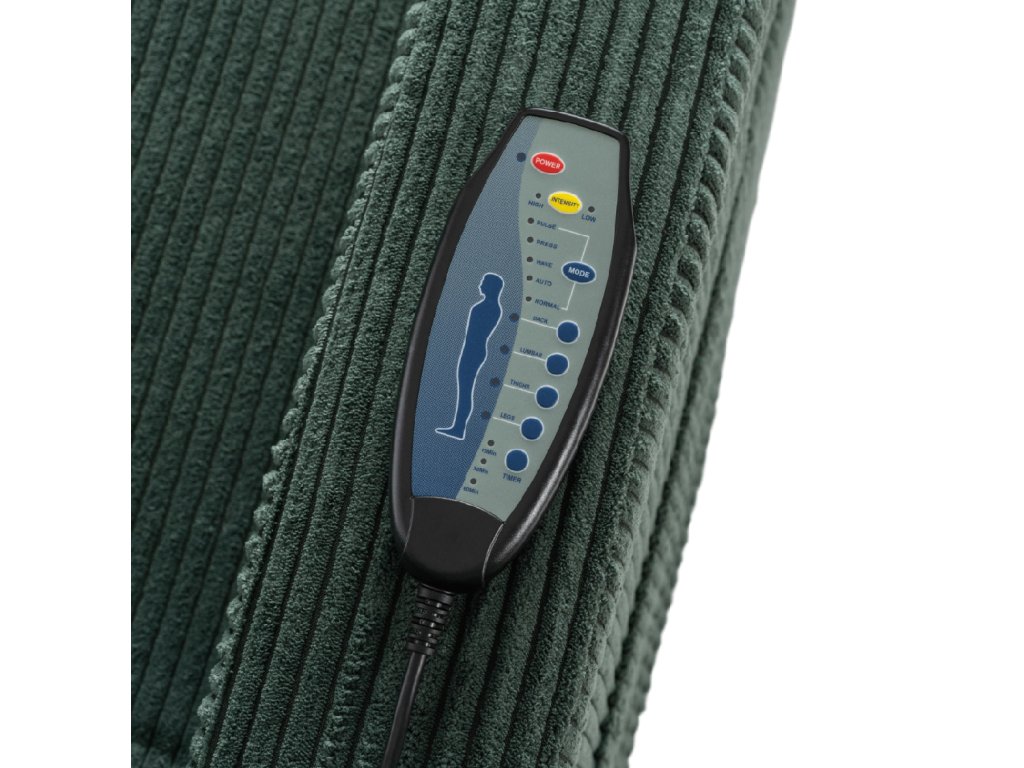 Z masažno funkcijo si lahko privoščite sprostitev nog, stegen, bokov in hrbta. Upravljanje je enostavno preko daljinskega upravljalnika, kjer nastavite intenzivnost in čas masaže po potrebi. Praktični detajli, kot so odpirajoči se naslonjali z odlagalnim prostorom in nastavljiv naslon za noge, povečujejo udobje pri vsakem uporabi.