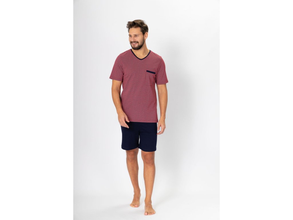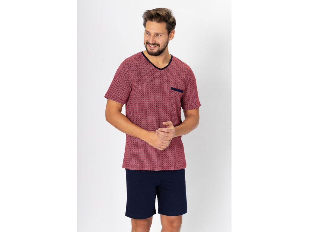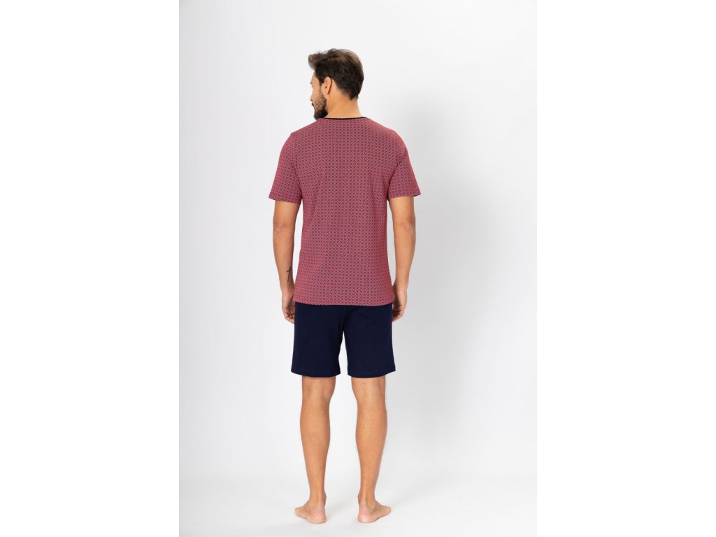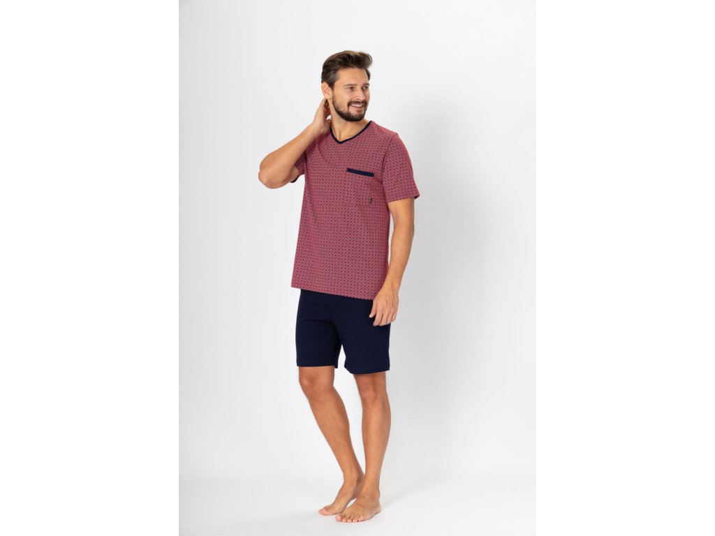 Moška pižama modra Carl sestavlja majica s kratkimi rokavi in nežnim geometričnim vzorcem, dopolnjena z diskretnim kontrastnim žepom. Enobarvne kratke hlače z elastičnim pasom odlično dopolnjujejo zgornji del in zagotavljajo svobodo gibanja. Ne glede na to, ali počivate doma ali se pripravljate na spanje, se boste v tej pižami počutili prijetno.