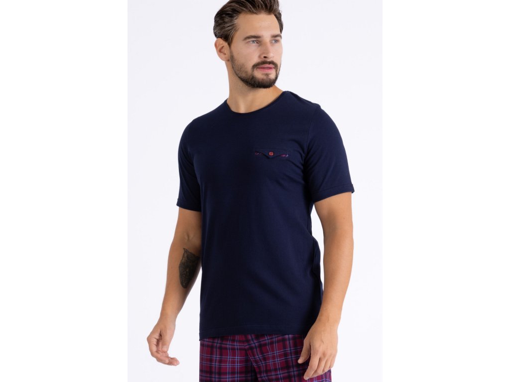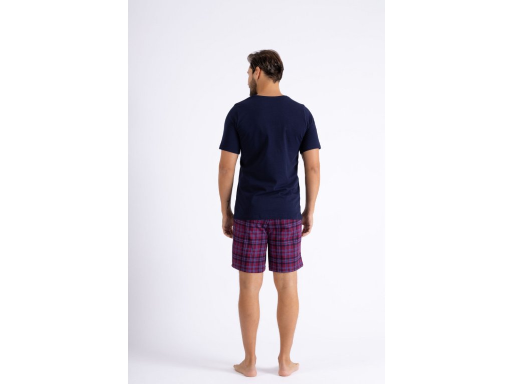 Enobarvna majica z okroglim izrezom in kratkimi rokavi dopolnjujejo kratke hlače s karo vzorcem in elastičnim pasom. Skupaj ustvarjata moderen videz, ki je primeren za vsakodnevno nošenje in nočni počitek.