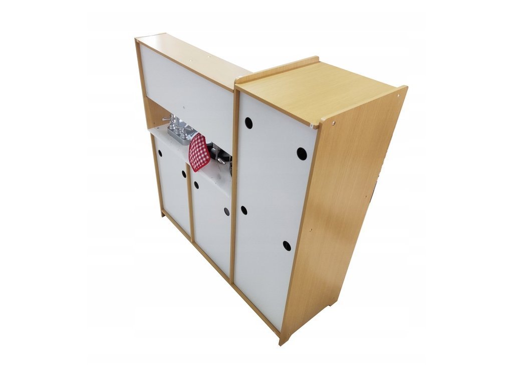 Kuhinja je izdelana iz kakovostne MDF plošče v kombinaciji s plastičnimi elementi, kar zagotavlja njeno dolgo življenjsko dobo in varnost za otroke. Površine so gladke in skrbno obdelane, da se zmanjša tveganje za poškodbe. Zaradi natančne izdelave in trdnih materialov je kuhinja stabilna in odporna.