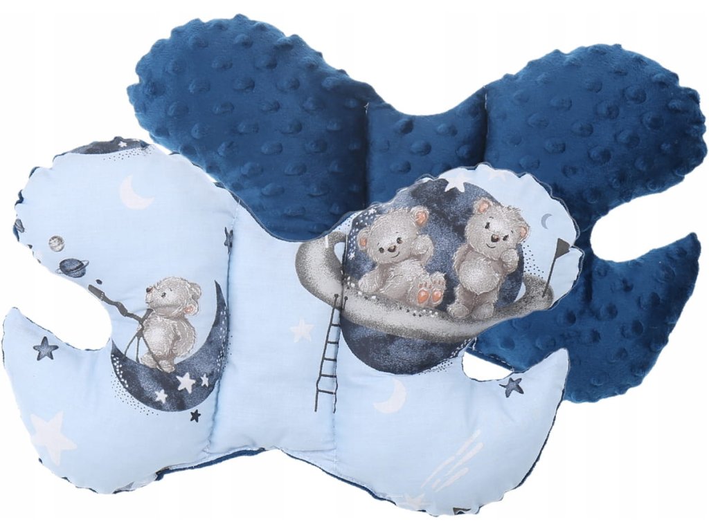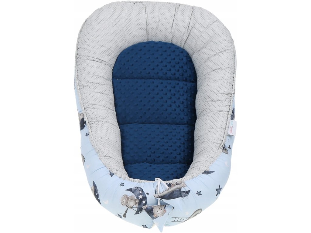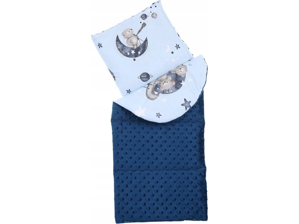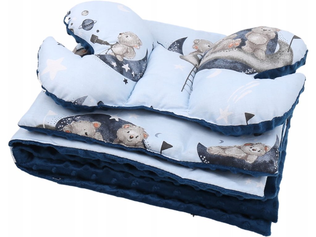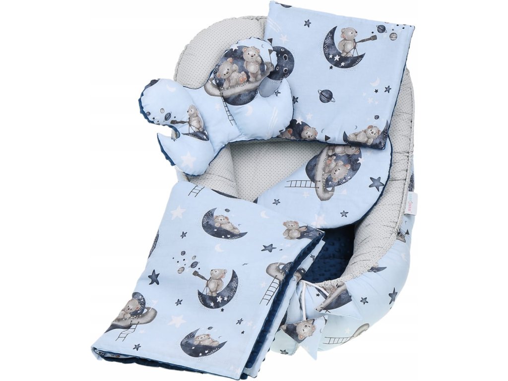 Set za posteljico, 7-delni, vzorec: medvedek, barva: modra, siva, material: bombaž, minky, v paketu: gnezdo, antišok vzglavnik, odeja, vzmetnica, raven vzglavnik, zavijalna odeja, bombažni prevlek, pranje v pralnem stroju pri temperaturi 40°C