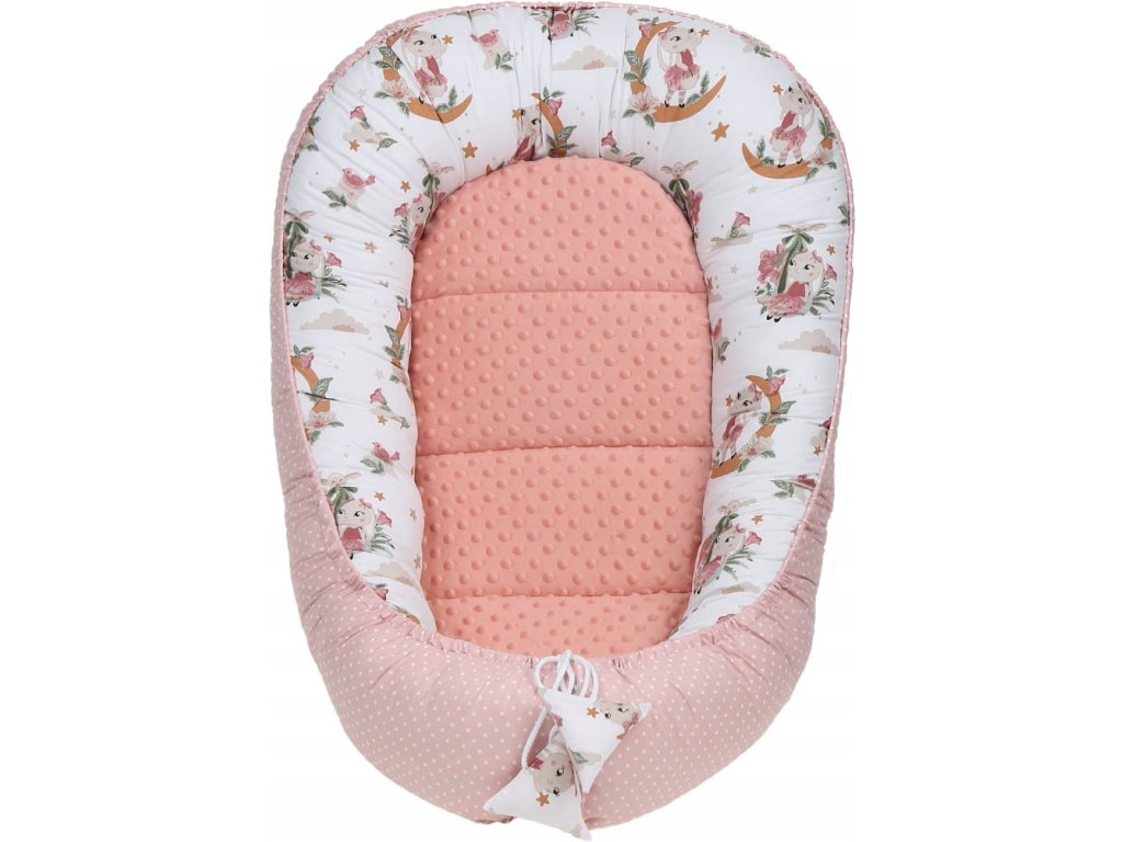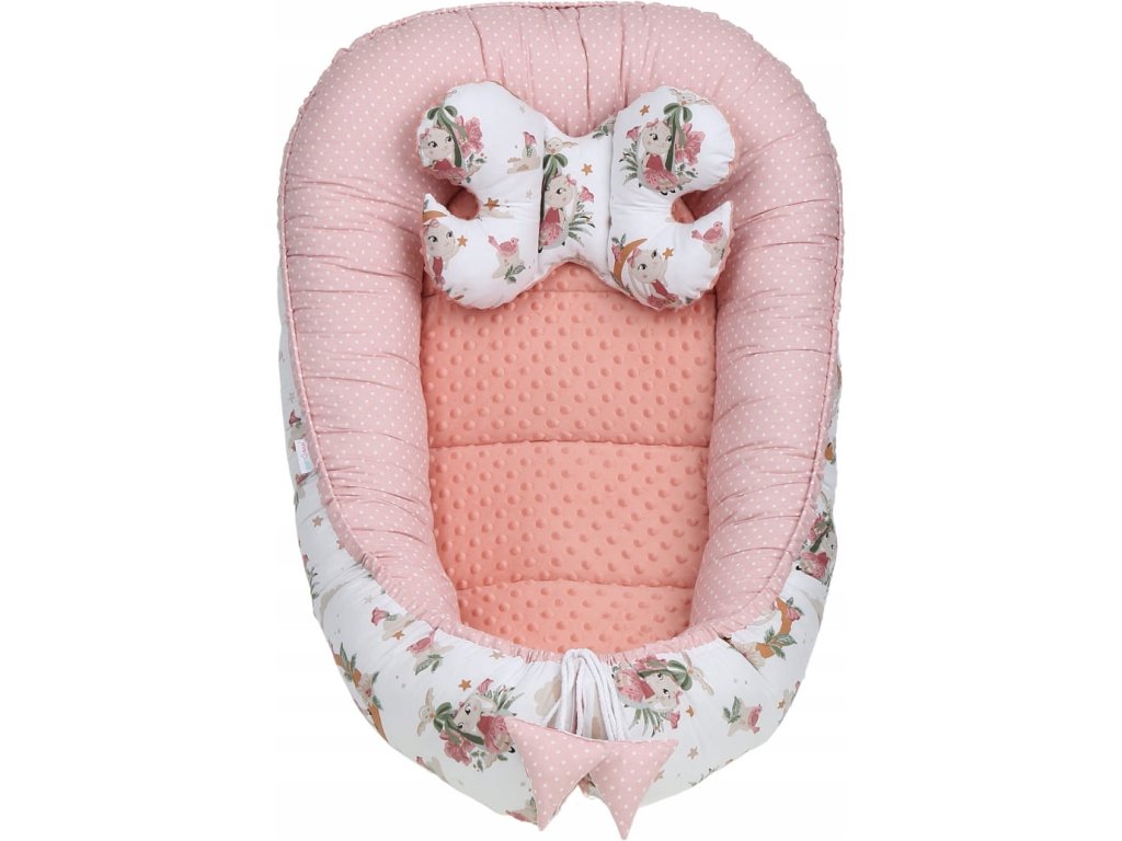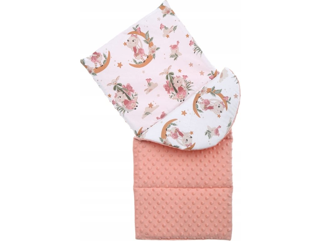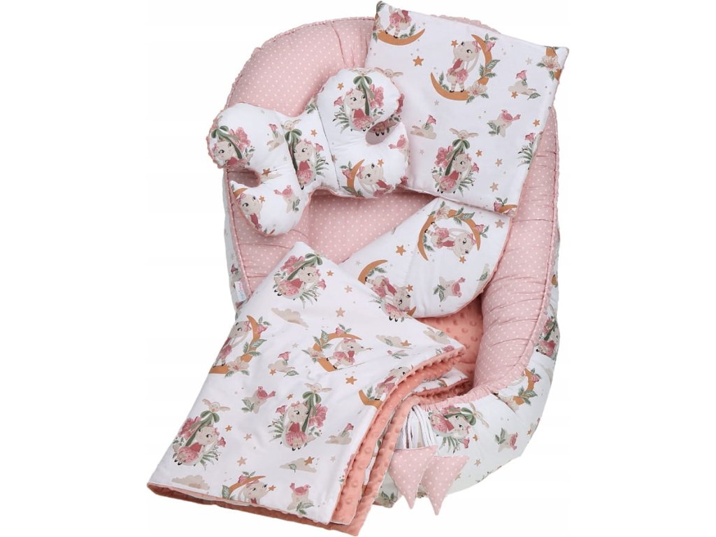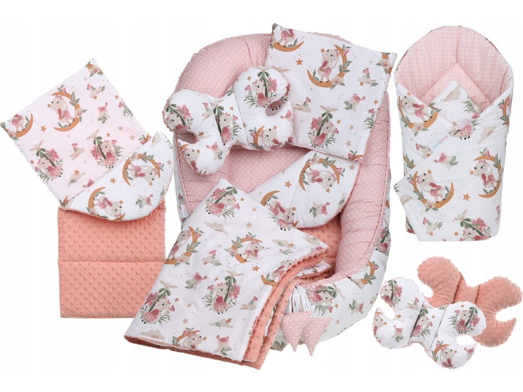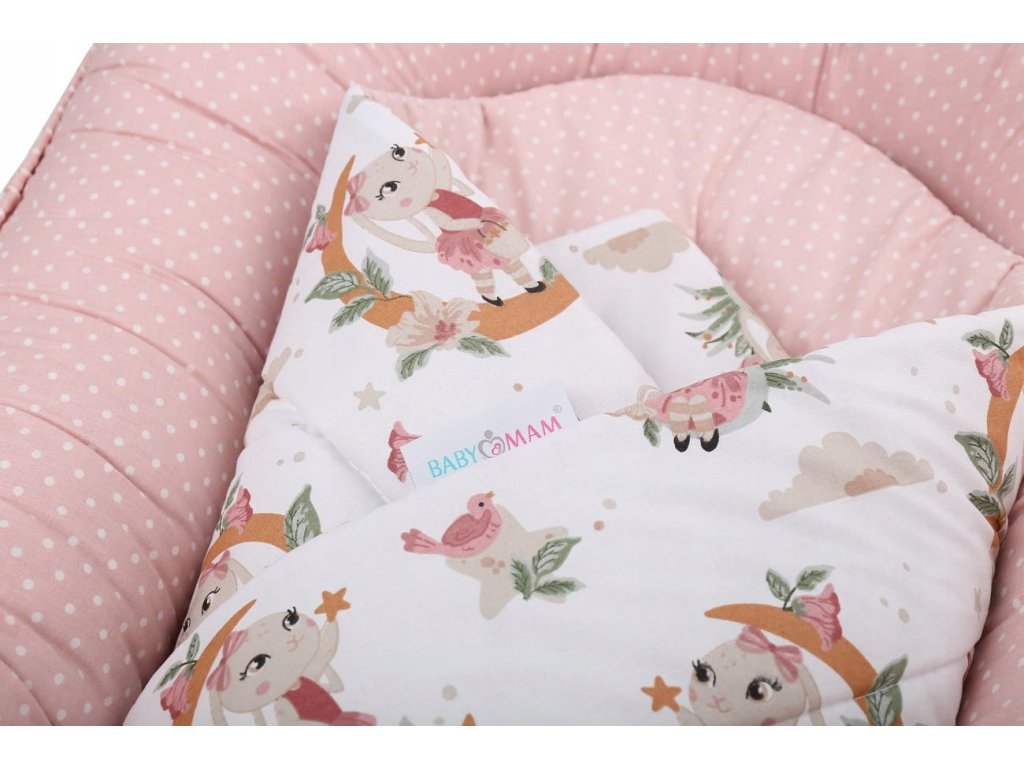 Komplet za posteljico, 7-delni, vzorec: zajček, barva: roza, bela, material: bombaž, minky, v kompletu: gnezdece, anti-šok vzglavnik, odeja, vzmetnica, ploščat vzglavnik, zavitje, bombažna prevleka, pranje v pralnem stroju pri temperaturi: 40 °C