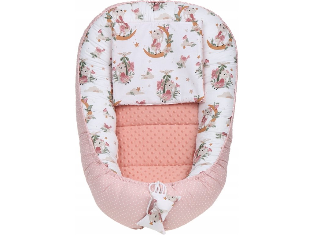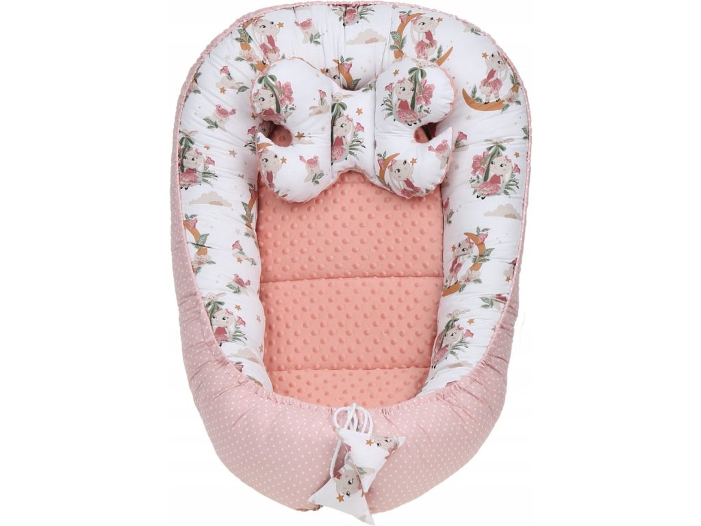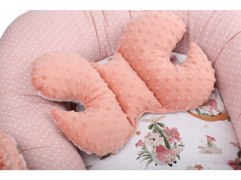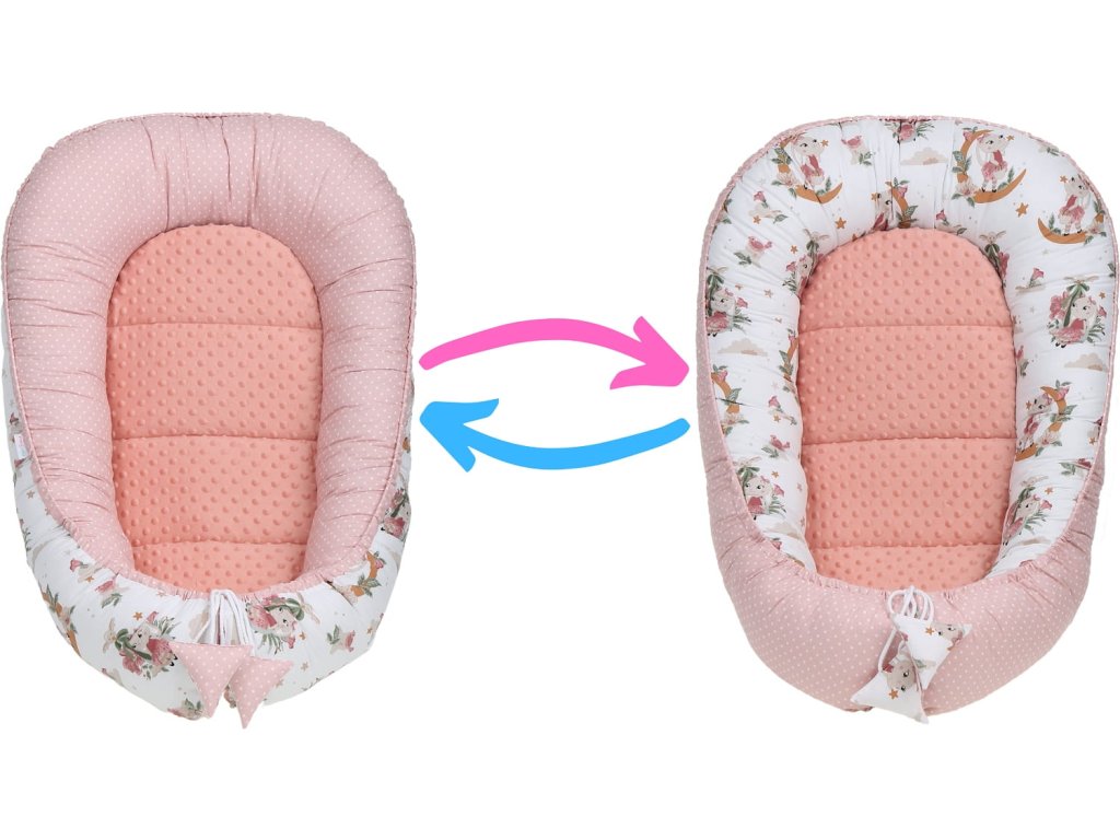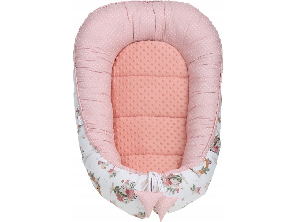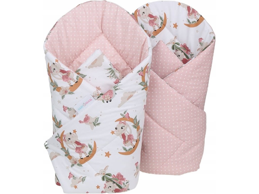 Komplet za posteljico, 7-delni, vzorec: zajček, barva: roza, bela, material: bombaž, minky, v kompletu: gnezdece, anti-šok vzglavnik, odeja, vzmetnica, ploščat vzglavnik, zavitje, bombažna prevleka, pranje v pralnem stroju pri temperaturi: 40 °C