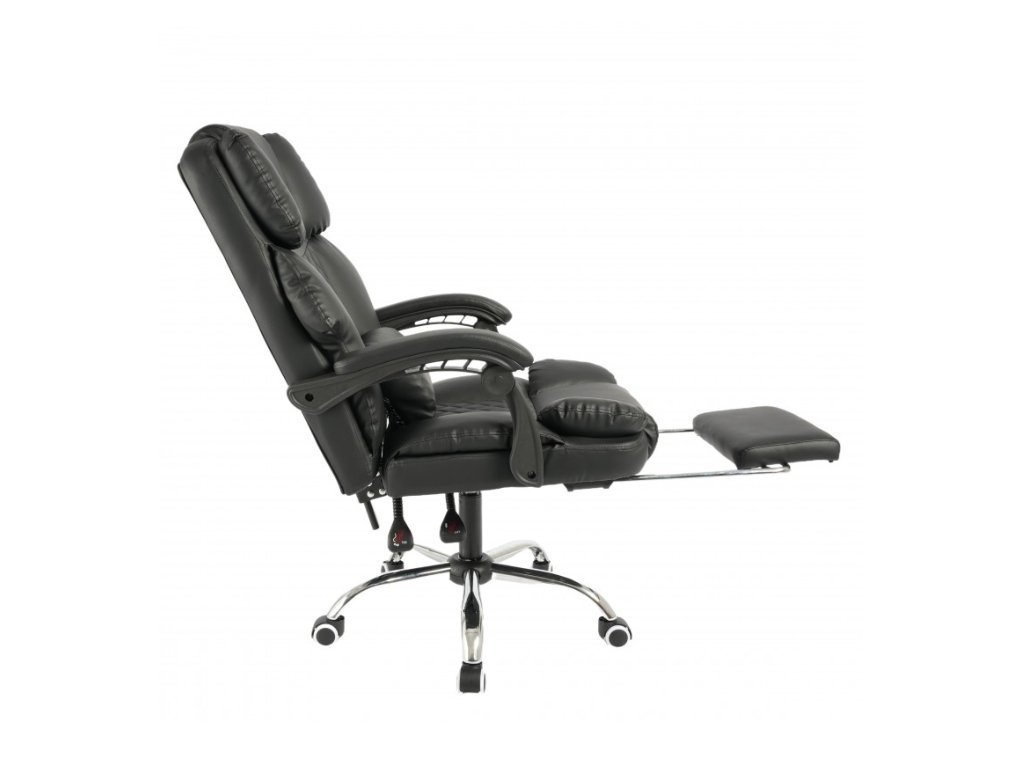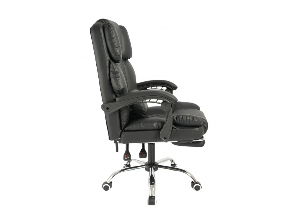 Stol je opremljen s širokim in mehkim sedežem, ki zagotavlja udobje tudi med dolgim sedenjem. Naslonjalo je ergonomsko oblikovano, da podpira naravno ukrivljenost hrbtenice, vsebuje pa tudi udoben naslon za glavo. Zgornji del naslonov za roke je oblazinjen, kar povečuje udobje za roke. Črna barva eko usnja daje stolu moden in univerzalen videz, ki se prilega vsakemu interierju.