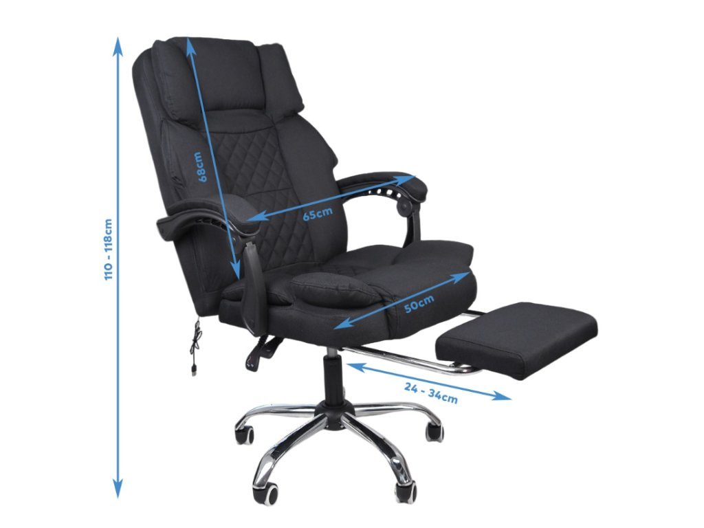 Masážny USB systém pomáha uvoľniť svalové napätie, zlepšuje krvný obeh a podporuje správne držanie tela. Počas práce alebo po nej môžete zapnúť jemné vibrácie, ktoré zmiernia únavu a bolesť chrbtice, kreslo je ideálne pre ľudí, ktorí trávia veľa času pri počítači.