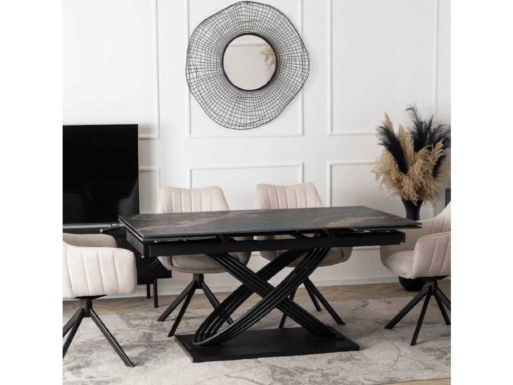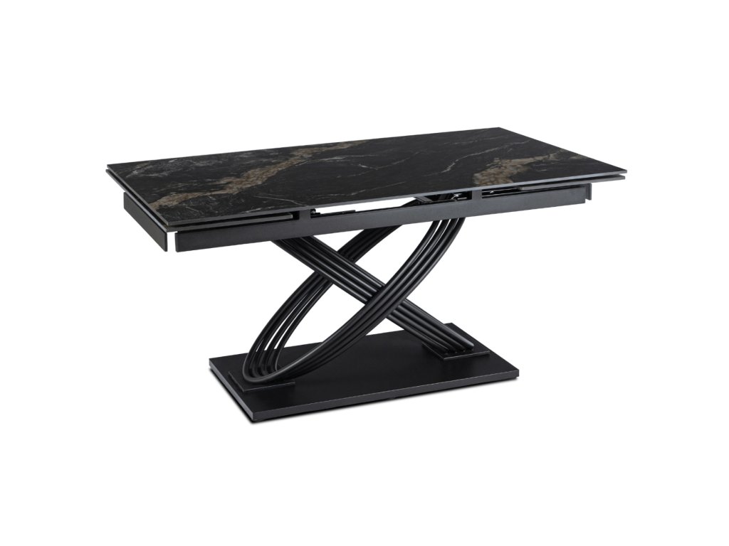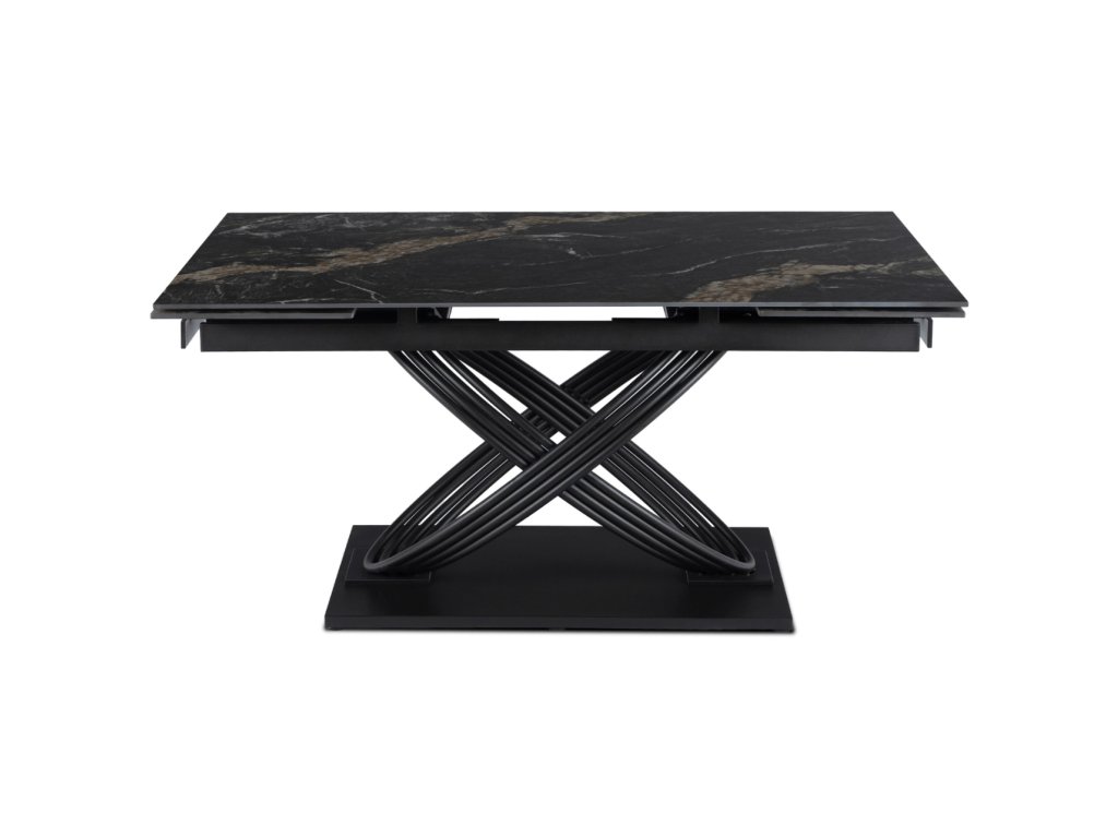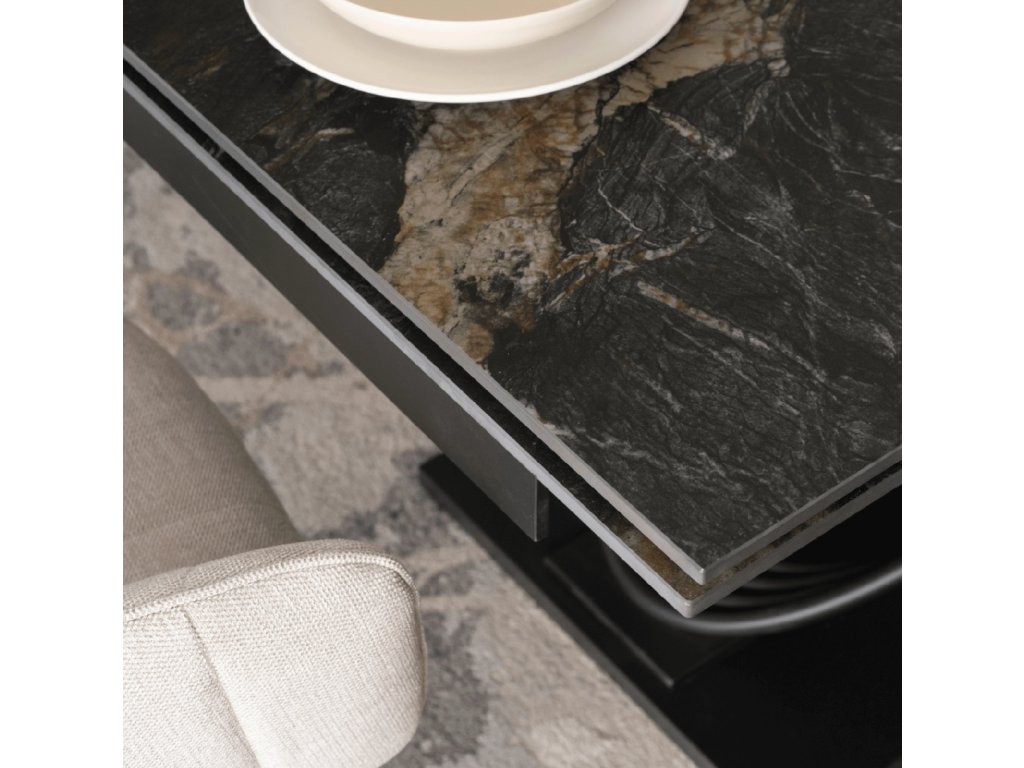 Plošča je izdelana iz pečenega kremenčevega kamna z obdelavo črnega marmorja, ki je izjemno odporen proti praskam, vročini in vlagi. Kovinska konstrukcija s križanimi nogami zagotavlja stabilnost in hkrati dopolnjuje sodoben dizajn.