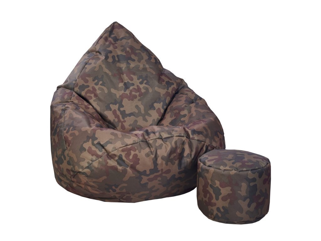 Sedežna vreča z naslonom za noge, barva: vojaška, višina: 120 cm, širina: 100 cm, dolžina: 75 cm, stolček: višina: 20 cm, premer: 40 cm, polnilo: polistiren, material: blago Skai