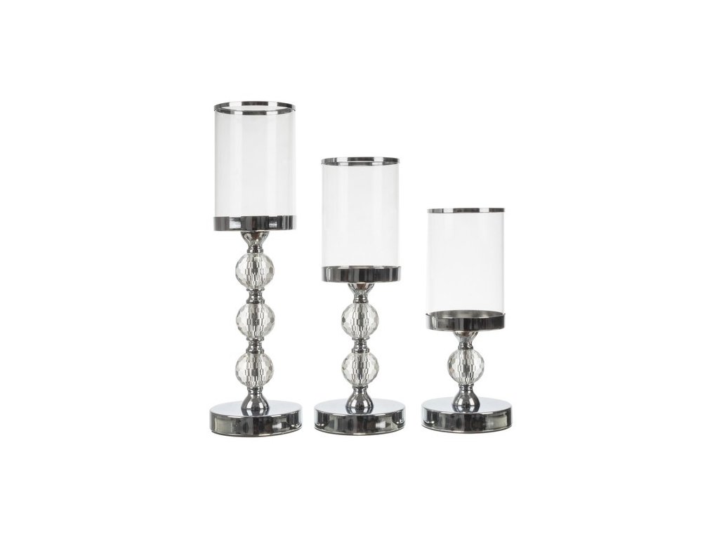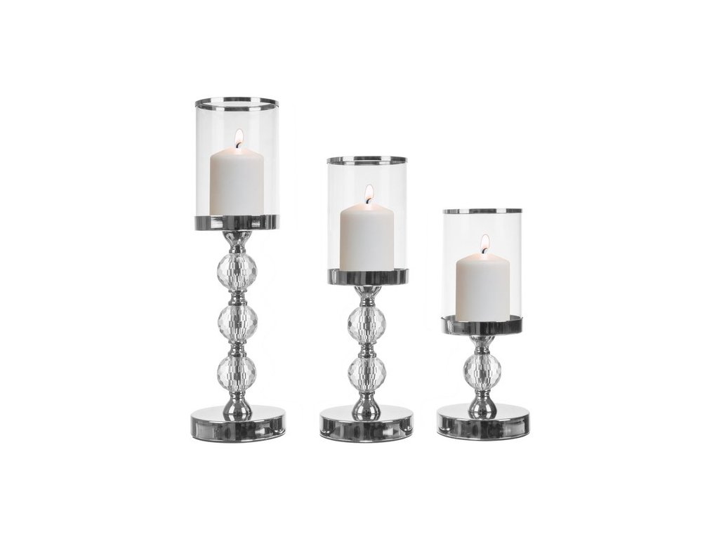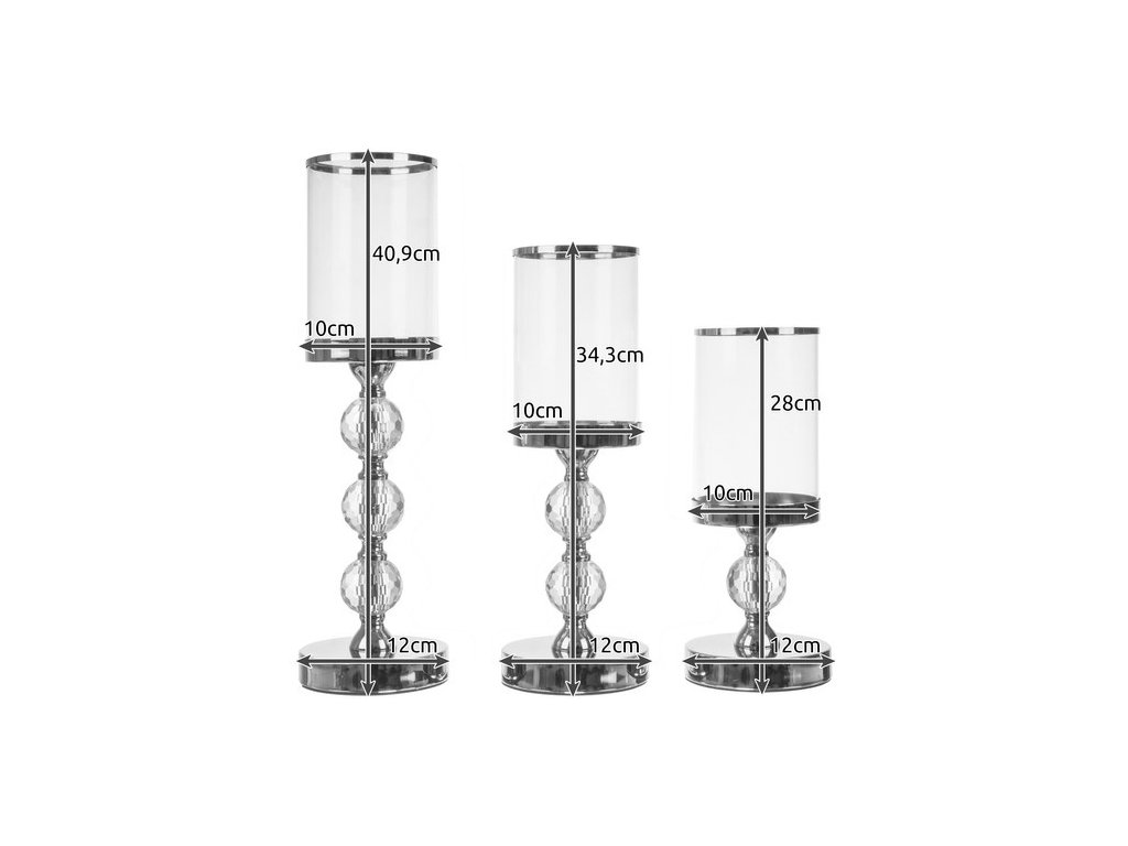 Komplet vsebuje tri svečnike različnih višin, ki skupaj ustvarjajo harmonično celoto. Vsak svečnik ima okrasno nogo z imitacijo kristalov: najmanjši en kristal, srednji dva in največji tri. Kombinacija različnih višin deluje estetsko in prostoru dodaja globino ter eleganco.