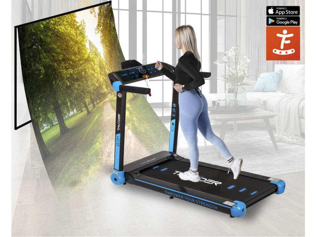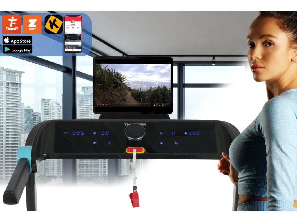 Odkrijte široke možnosti, ki jih ponuja sodelovanje tekalne steze THUNDER® s pametnimi aplikacijami. Z njihovo pomočjo lahko spremljate svoj čas, razdaljo, porabljene kalorije in še veliko več informacij. Sledite prednastavljenim programom vadbe ali ustvarite lastne načine, ki najbolj ustrezajo vašim potrebam. Svoje rezultate lahko tudi primerjate s prijatelji ali drugimi uporabniki z vsega sveta, vključno z resničnimi trasami po mestih.