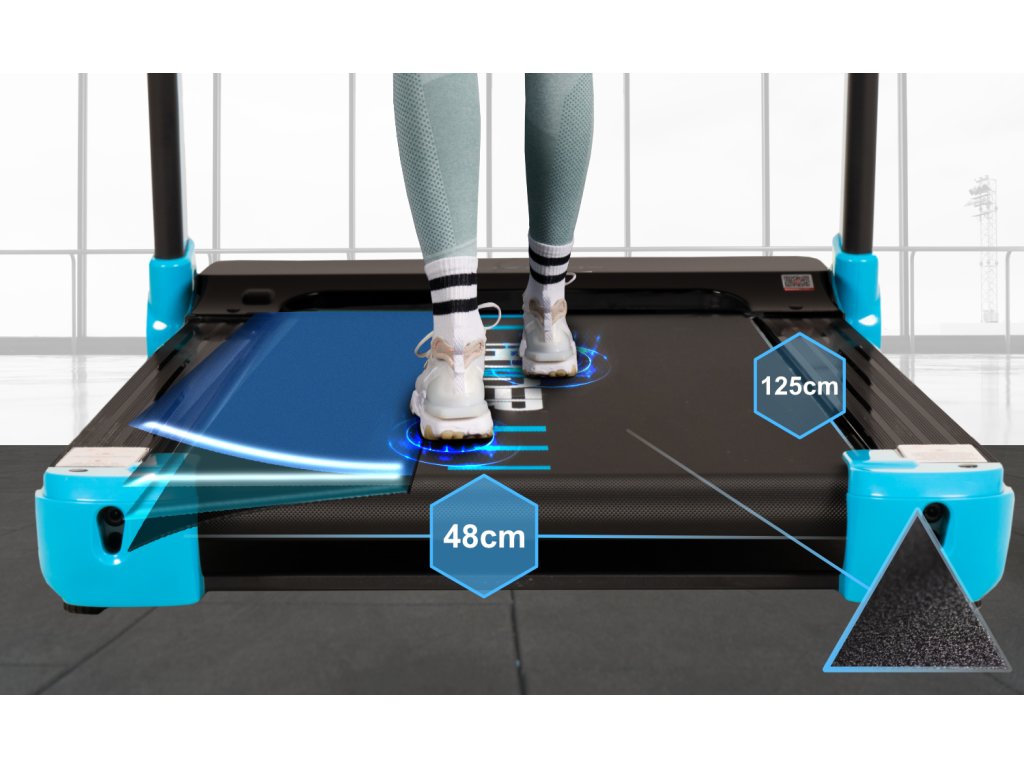 Tekalna steza je opremljena z LED zaslonom, ki prikazuje čas, hitrost, razdaljo in kalorije. Ima vgrajen zvočnik za boljšo izkušnjo vadbe, magnetni varnostni ključ pa vas ščiti, če se morate nenadoma ustaviti. Naprava je opremljena s transportnimi kolesi, tako da jo lahko enostavno premaknete kamor jo potrebujete.