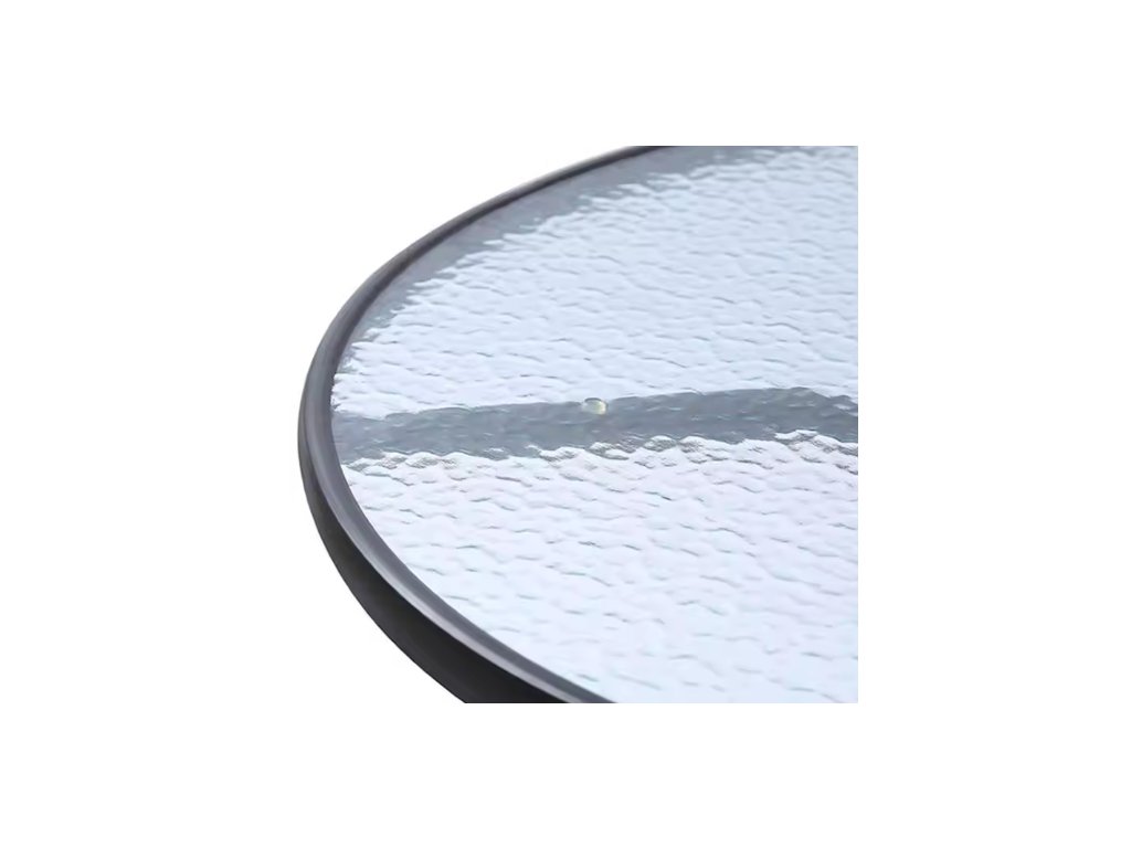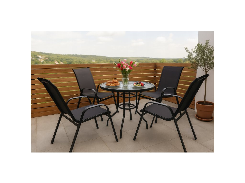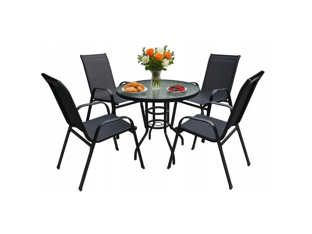 Konstrukcija mize in stolov je izdelana iz jekla s prašnim premazom, ki je odporen proti koroziji in vremenskim spremembam. Namizna plošča iz stekla nudi moderen videz in enostavno vzdrževanje.