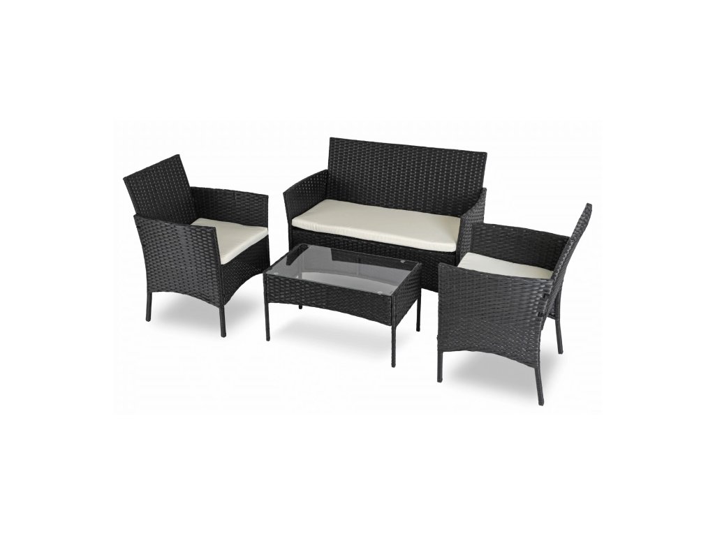 Vrtna garnitura iz ratana, fotelj: širina: 55 cm, globina: 57 cm, višina: 87 cm, miza: dolžina: 71 cm, širina: 41 cm, višina: 39 cm, sedežna garnitura: dolžina 98 cm, širina 57 cm, višina 87 cm, debelina stekla 5 mm, material kovinska konstrukcija, PE ratan, število sedežev 4, največja nosilnost 150 kg, največja nosilnost mize 50 kg, teža 27 kg, barva: črna, krem blazine