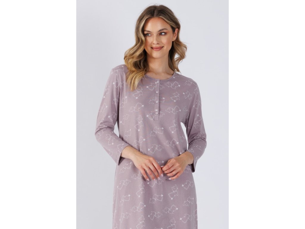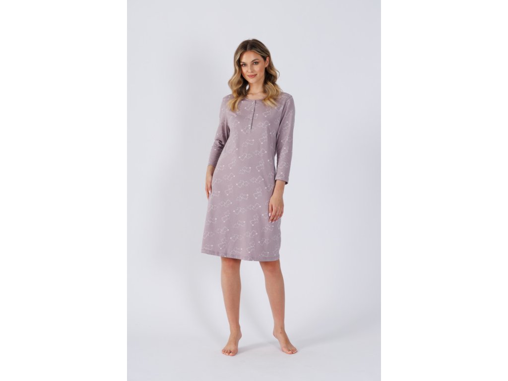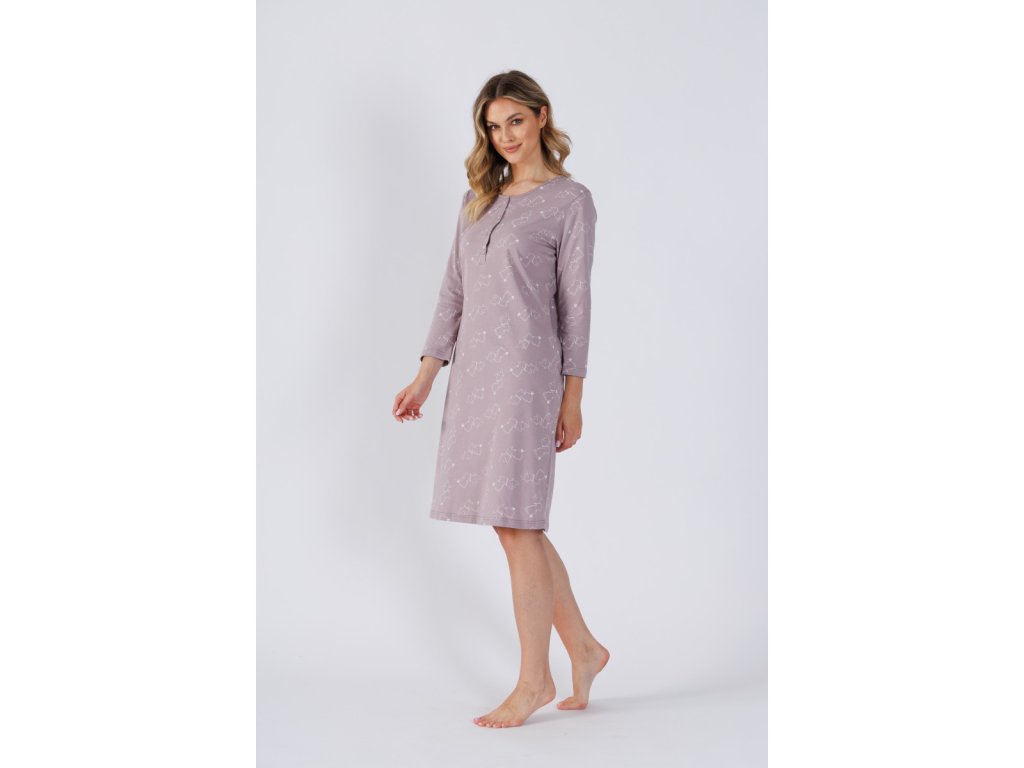 Izdelana iz 100 % bombaža, je zračna, mehka in primerna tudi za občutljivo kožo. Bombaž pomaga ohranjati optimalno telesno temperaturo in zagotavlja udobje skozi celo noč. Ravna, ohlapna kroj z dolžino do kolen in 3/4 rokavi omogoča neomejeno gibanje. Okrogli izrez z nežnim zapiranjem na gumbe olajša oblačenje. Nežen tisk po celotni dolžini srajce deluje diskretno. Barva v vijolično-sivi odtenek je umirjena in pomirjujoča, kar podpira sproščujoče vzdušje.