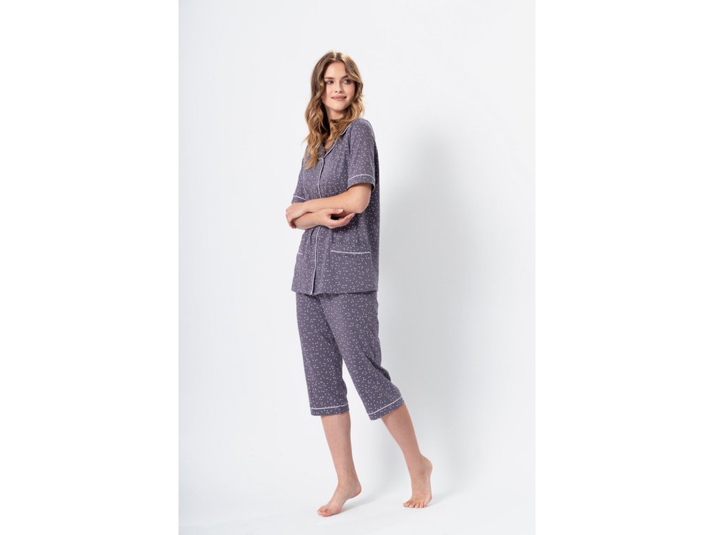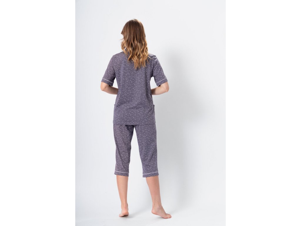 Zgornji del ima ovratnik, zapenjanje na gumbe in kratke rokave. Spodnji del dopolnjuje enak pikčast vzorec. Hlače imajo elastičen pas in dolžino pod koleni. Skupaj s zgornjim delom tvorijo udoben komplet, ki odlično izgleda tudi pri vsakodnevnem domačem nošenju.