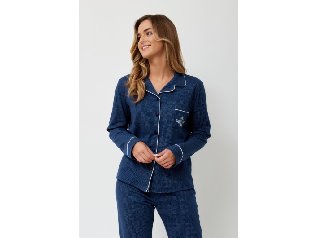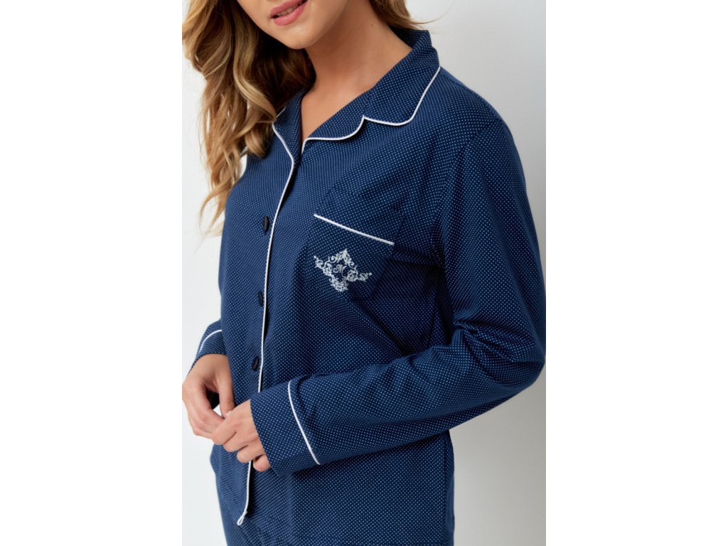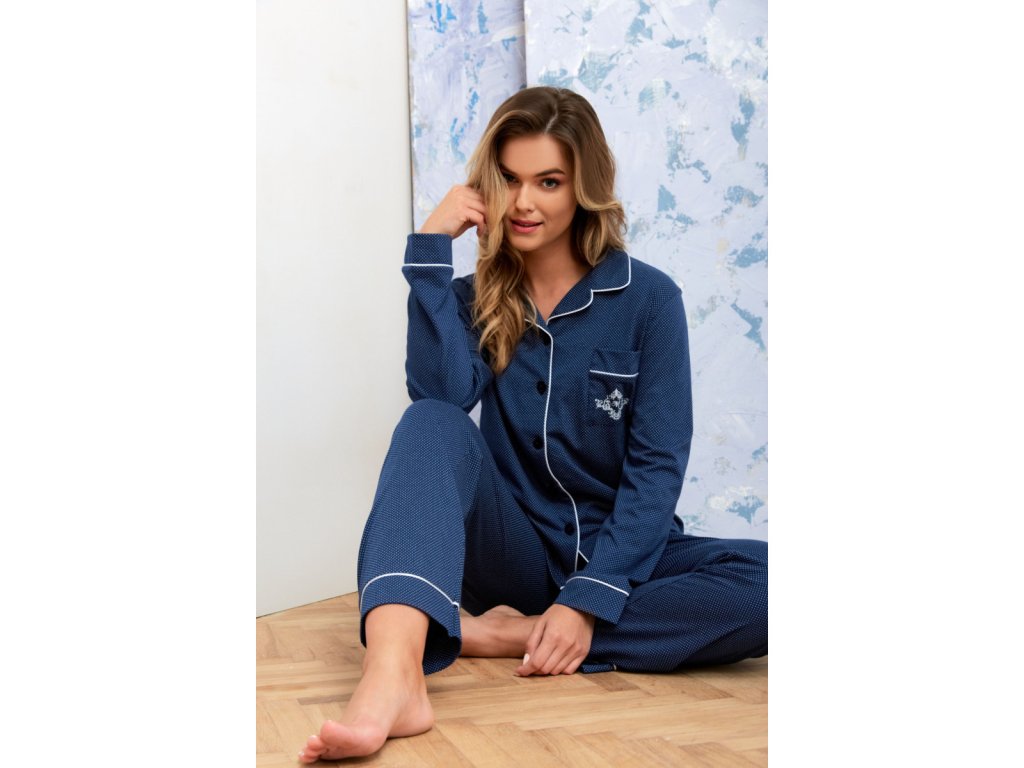 Želite si pižamo, v katerem se boste počutili prijetno, udobno in hkrati ženstveno? Žensko pižamo granatno modre barve Marina združuje eleganco, nežnost in poudarek na detajlih. Temno modra barva deluje pomirjujoče, medtem ko kontrastni elementi poudarjajo njegov modni videz. Idealno je za trenutke sprostitve, ki jih želite resnično uživati, bodisi zvečer ob knjigi ali zjutraj ob kavi.