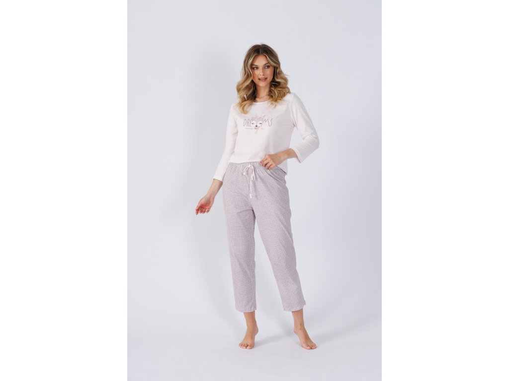 Pižama je izdelana iz 100 % bombaža, ki je naravno zračen, mehak in prijazen do kože. Pižama je idealna za spanje in domače udobje. Zgornji del ima okrogel izrez, dolge rokave in veselo potiskano sliko. Svetla podlaga deluje univerzalno, zato ustreza vsaki ženski. Spodnji del so ravne hlače z drobnim vzorcem. V pasu je elastičen trak z vezalko za zategovanje. Material je prijeten, lahek in prilagodljiv.