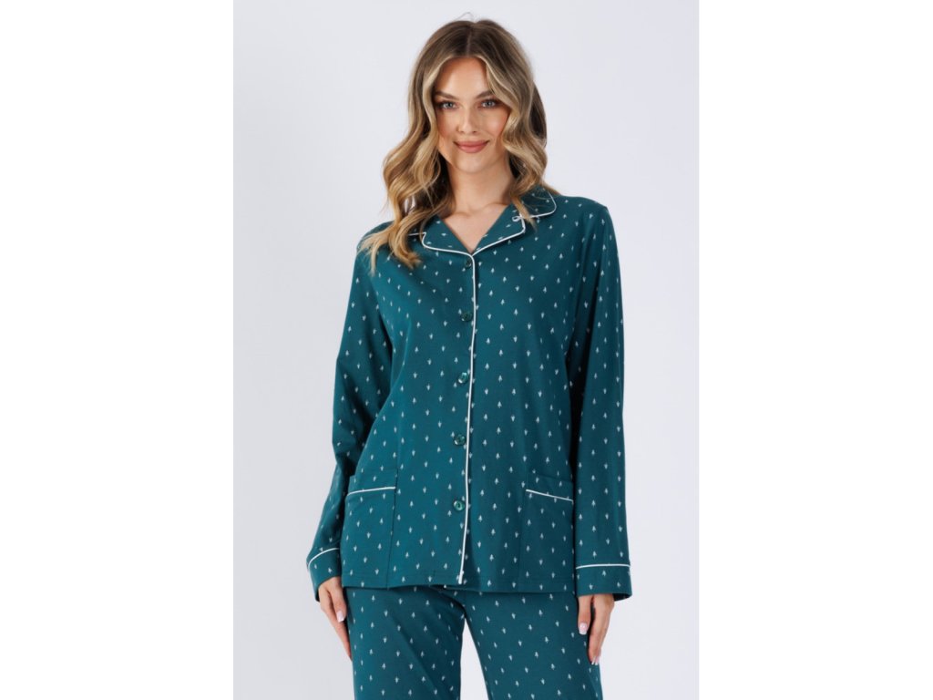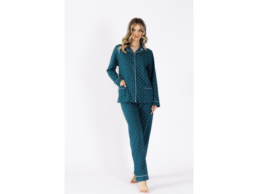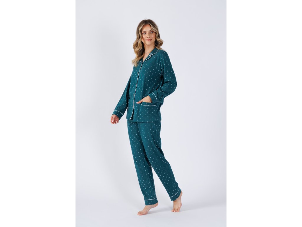 Zgornji del ima klasičen ovratnik, zapenjanje na gumbe, dolge rokave in dva sprednja žepa. Celoten zgornji del je okrašen z nežnim pikčastim vzorcem in kontrastnim belim robom, ki pižami daje eleganten videz.