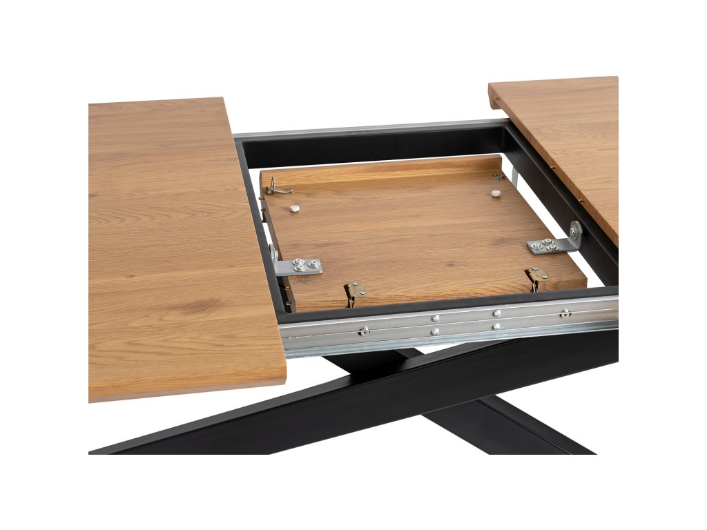 Mizna plošča je debela 3,2 cm in je izdelana iz laminiranega MDF v barvi rustikalnega hrasta. Odporna je na praske in odrgnine. Miza ima zložljivo funkcijo, zelo enostavno jo je raztegniti, samo podaljšajte mizo, vstavite dodatno desko in v hipu boste imeli 40 cm večjo mizo.